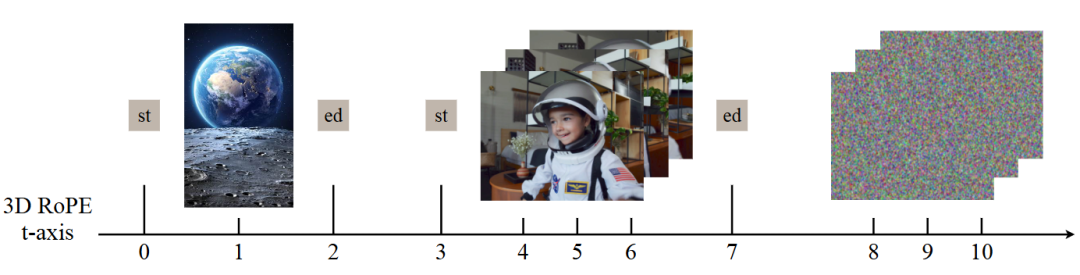 <|vision_start|> 和 <|vision_end|> Token 来标记 VAE 隐变量的边界,确保语义特征与隐变量特征的对应关系。 - 3D RoPE 策略:在时间轴上应用统一的 3D 旋转位置编码,以交错方式处理不同的视觉模态。