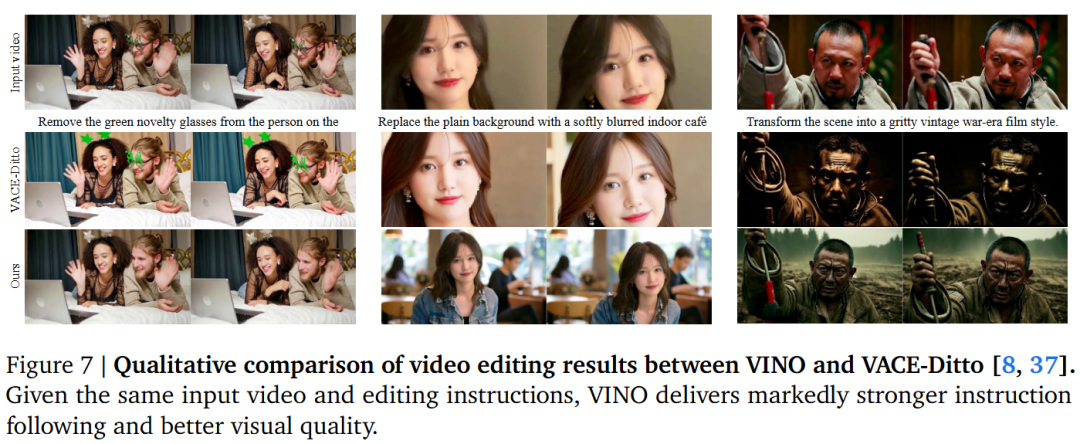 - 视频编辑:与 VACE-Ditto 等方法相比,VINO 在相同输入下展现了更强的指令遵循性和视觉质量,能够准确执行如“移除物体”、“风格转换”等复杂操作。