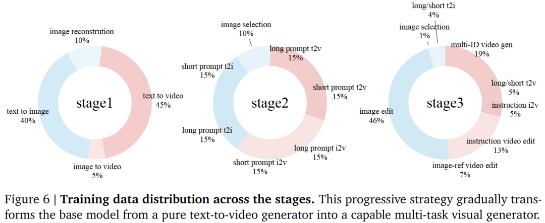 为了构建支持多模态条件的统一视觉生成器,本工作从一个文生视频扩散模型开始,因为它已经提供了强大的时间动态先验。为了替换原始的文本编码器,首先将 VLM 的输出空间与模型原生的文本编码器对齐。在这一初始阶段,仅训练一个两层 MLP 连接器以在两个嵌入空间之间进行映射。现代文生视频模型通常依赖长且结构良好的文本提示词,而编辑任务通常涉及简短的指令,这产生了分布差距。为了弥补这一差距,本工作采用了渐进式训练策略,逐步转变输入条件的分布。具体而言,将短提示词视为长提示词与简练编辑指令之间的中间形式。在第二阶段,使用长短提示词混合训练模型,以确保对两种形式的鲁棒性,并在该阶段开始更新 MMDiT 参数。一旦模型适应了短提示词输入,便进入最后阶段,进行全多任务混合训练。各阶段的数据混合比例如图 6 所示。这使得模型能够平滑地从结构化文本视频条件过渡到基于指令的多模态生成和编辑。