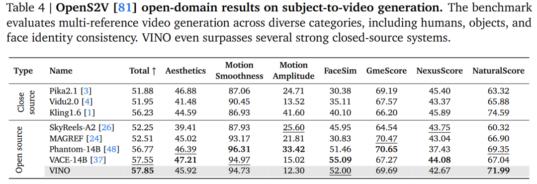 - 参考生成能力:在 OpenS2V 基准测试(针对特定主体的视频生成)中,VINO 表现出明显的优势,能够有效地根据参考图像生成定制化视频。