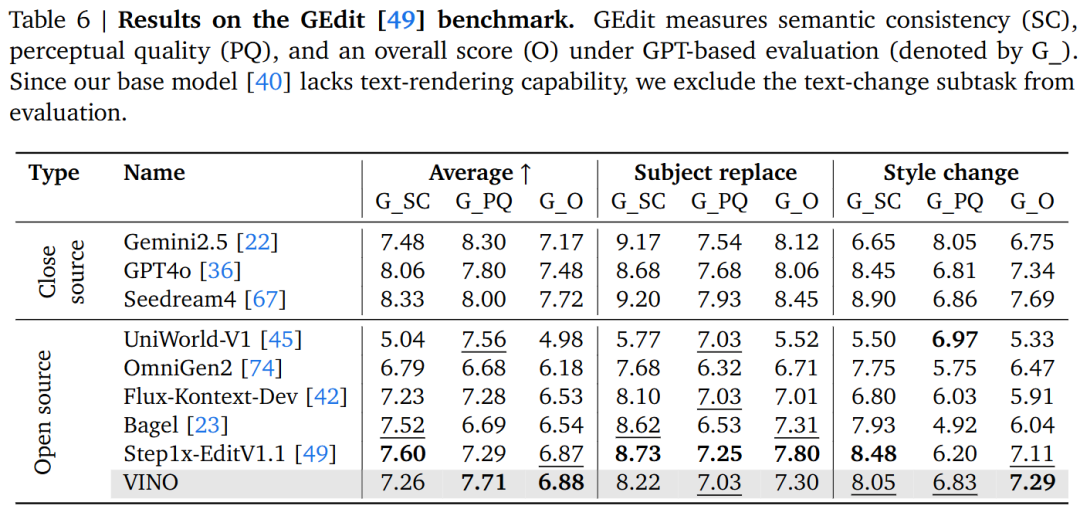 - 文本渲染能力:基础模型缺乏文本渲染能力,使得 VINO 在涉及文本编辑的基准测试中处于劣势。
