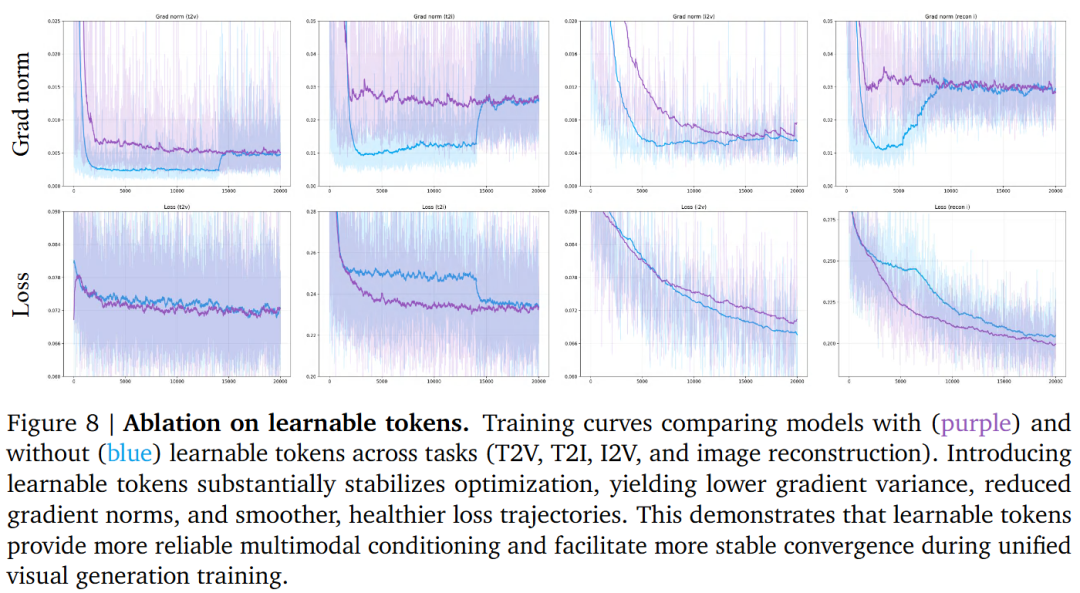 - 可学习 Token 的作用:引入可学习 Token 显著提升了训练的稳定性(优化曲线更平滑),并增强了多模态条件的保真度。去除这些 Token 会导致梯度噪声变大,且在物体移除/替换等任务中表现下降。