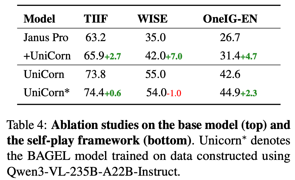 局限性尽管在 T2I 生成和多模态理解方面都取得了稳健的表现,UniCorn 仍存在一定的局限性。首先,目前的自我提升框架以单轮方式运行,主要增强生成能力,未观察到理解指标的显著提升。在未来的工作中,本文打算探索多轮迭代自我博弈,以促进这两种能力的共同进化。其次,自我博弈机制要求 UMM 处理提示生成、推演和判断,这不可避免地引入了额外的计算成本。本文计划在后续研究中调查更高效的方法来简化这一过程。