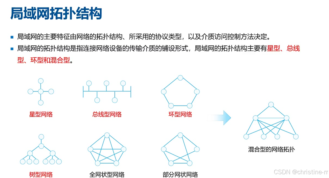 局域网拓扑结构 | 总线型、环形、树形、全网状、部分网状、混合型 | 各种拓扑结构的特征和应用场景 | 中 |