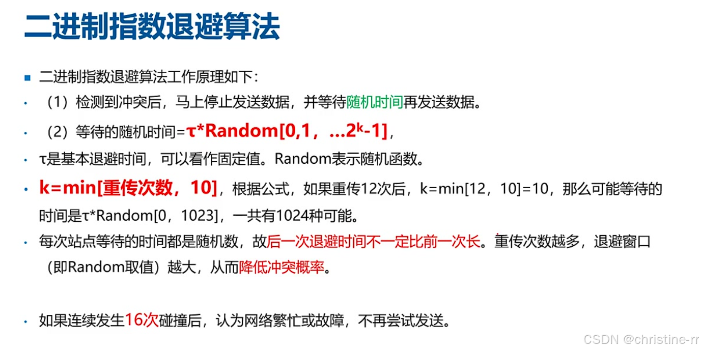 冲突与重传次数关系 | 重传次数越多,退避窗口值越大,降低冲突概率 | 不能杜绝冲突,只能降低概率 | 🌟🌟 |