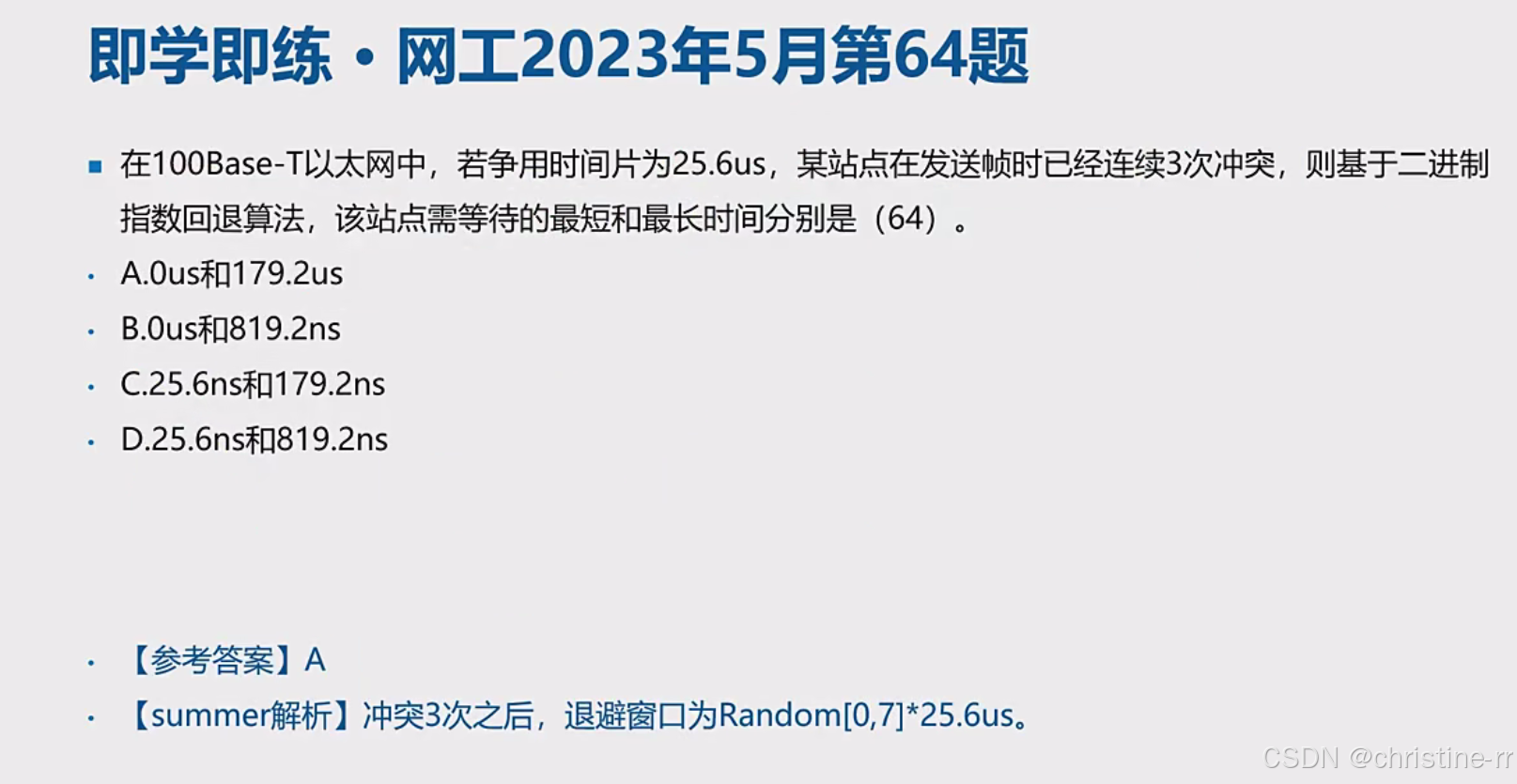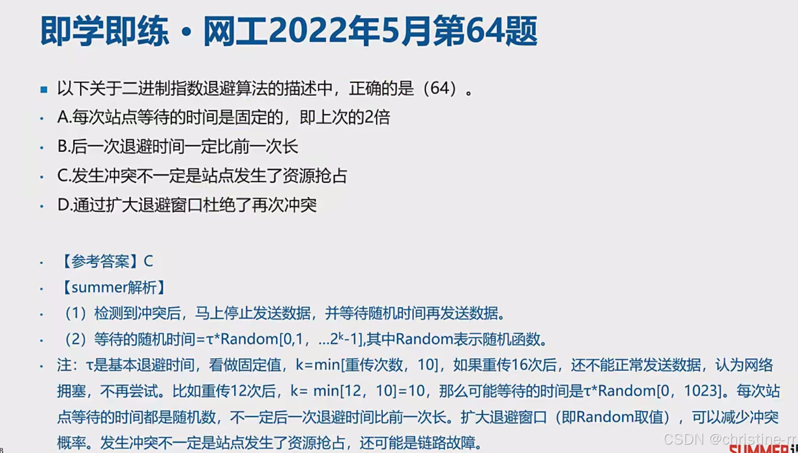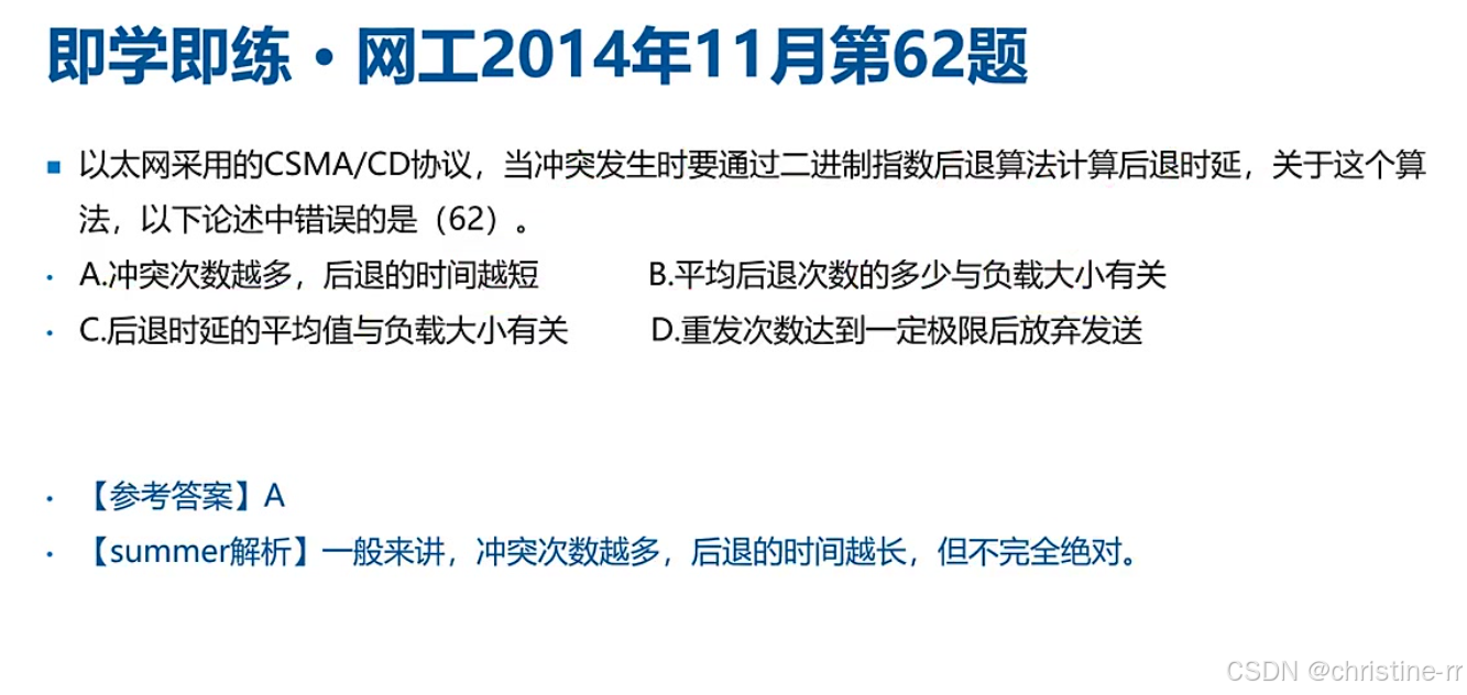 错误论述识别 | “冲突次数越多,后退时间越短”为错误论述 | 冲突次数多,k值大,后退时间应更长(平均而言) | 🌟 |