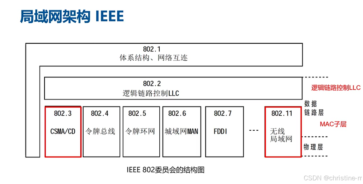 标准代号:局域网的标准代号是IEEE 802,由电子电气工程师协会(IEEE)制定。 基本架构:局域网的基本架构可以分为两层,分别是MAC子层和逻辑链路控制(LLC)子层。