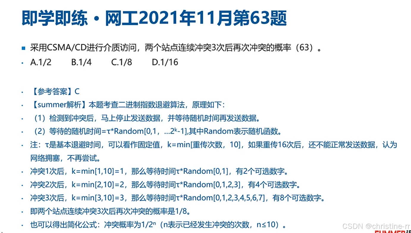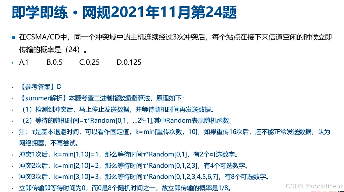 题目: 在CSMA/CD中,同一个冲突域中的主机连续经过3次冲突后,每个站点在接下来信道空闲的时候立即传输的概率是多少?