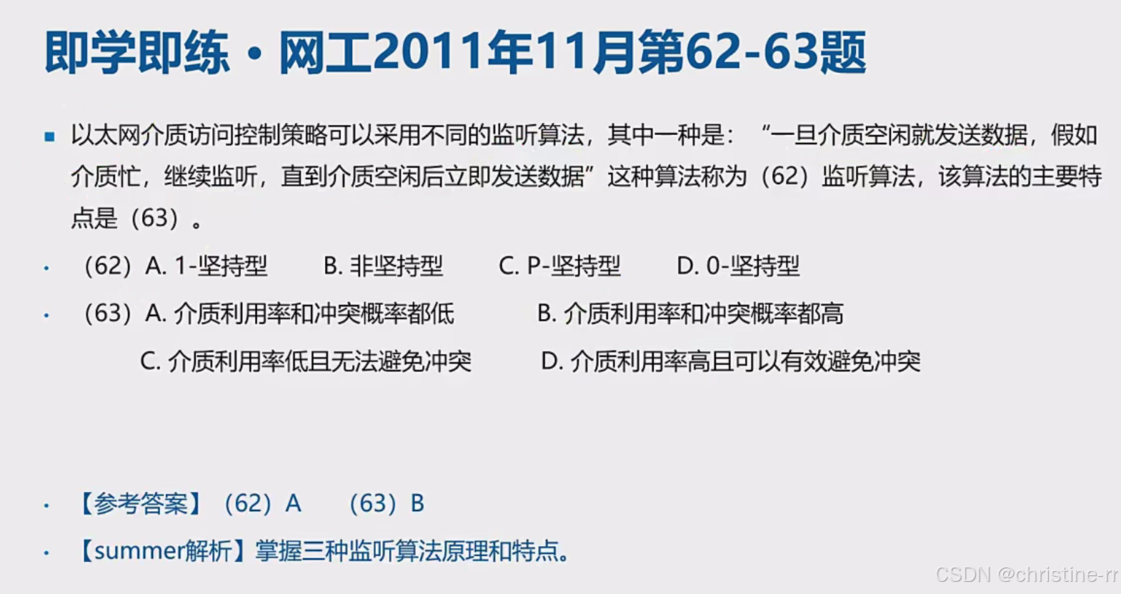 易错点: 容易误选非坚持型或P-坚持型,需要准确理解各种监听算法的原理和特点。