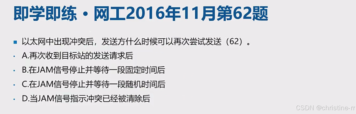 选项D: 当JAM信号指示冲突已经被清除后。JAM信号本身不指示冲突是否清除,只是通知所有站停止发送,故D错误。
