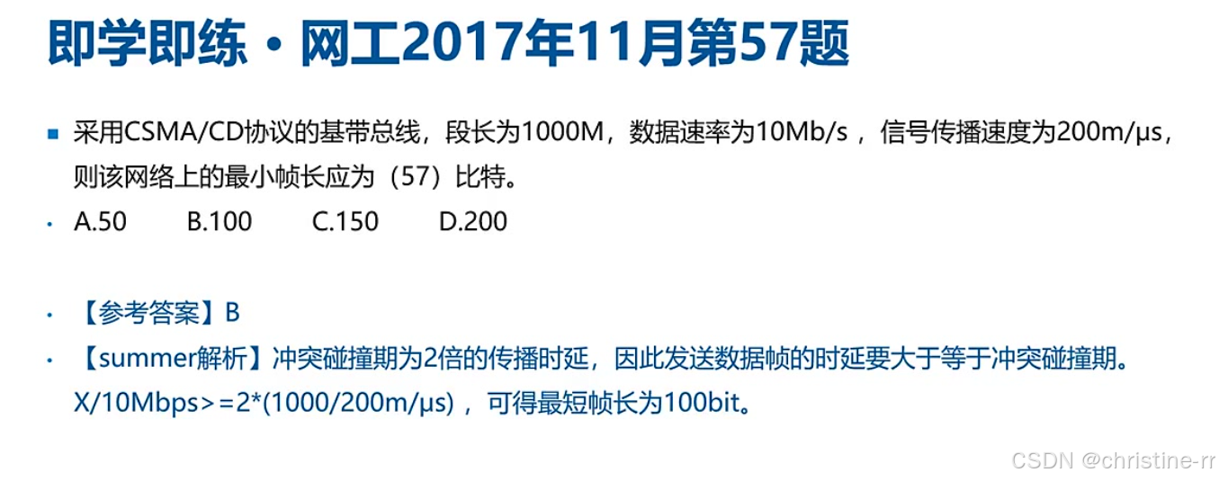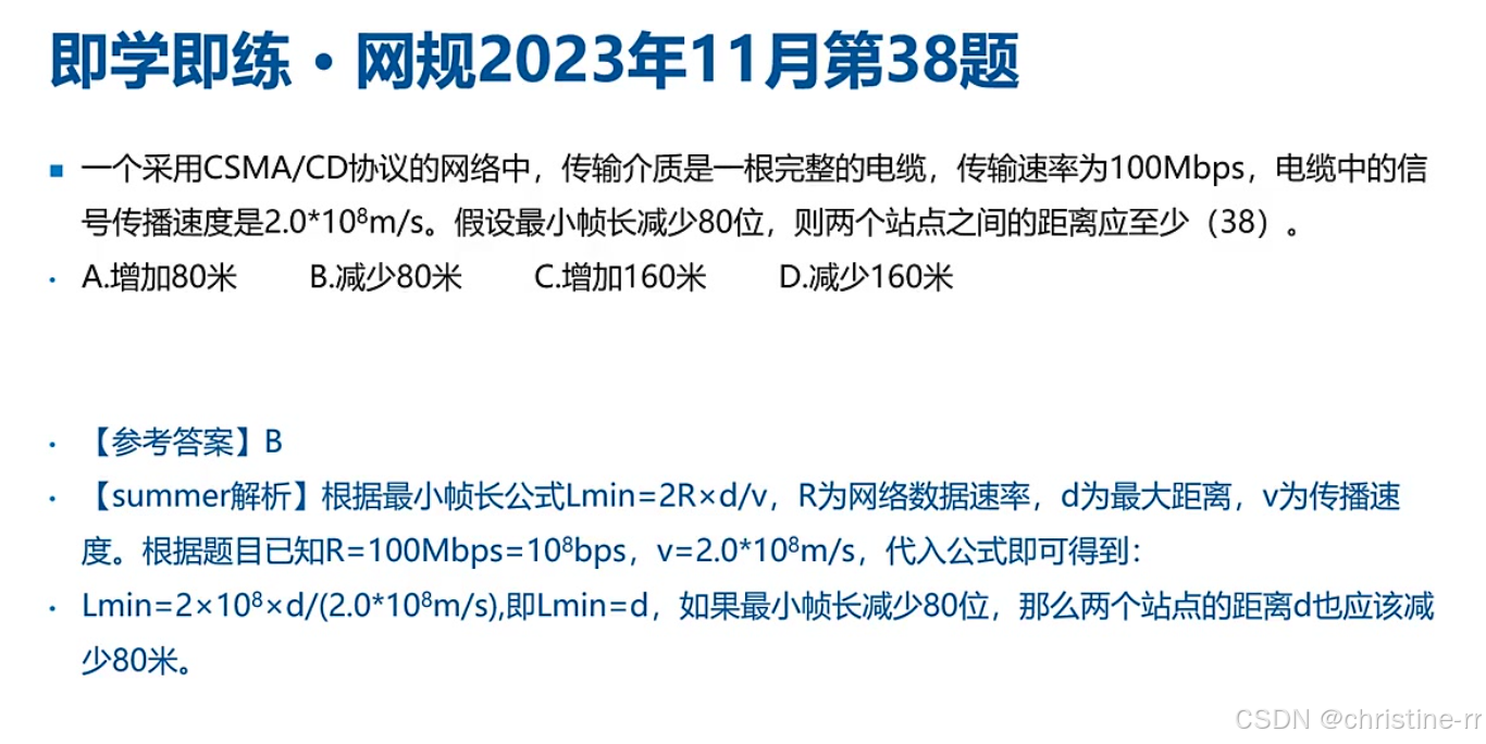 冲突检测的物理意义(发送时间≥2×传播时延) 公式Lmin=2R×d/v的三种考法:计算帧长、计算距离、判断检测时间 单位换算的准确性(特别是Mbps与m/μs的转换)