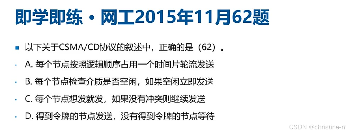 选项A: 每个节点按照逻辑顺序占用一个时间片轮流发送。这是TDMA的特点,不是CSMA/CD,故A错误。