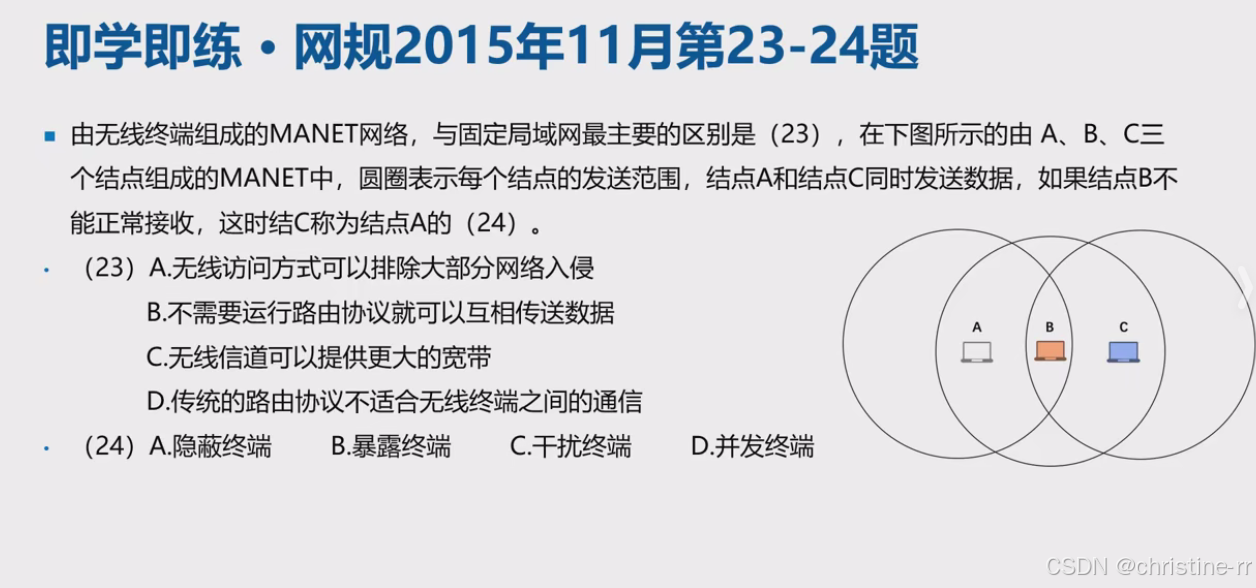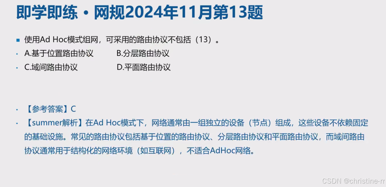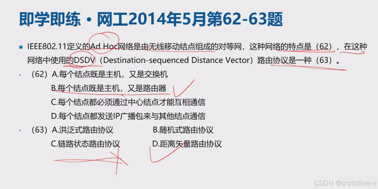 典型考题解析 | 1. 最大区别:需新型路由协议(排除传统协议如RIP/OSPF) 2. 隐蔽终端识别 3. 协议类型判断(如DSDV为距离矢量) | 高频选项:D(区别)、A(隐蔽终端)、B/D(协议类型) | ⭐⭐⭐⭐ |