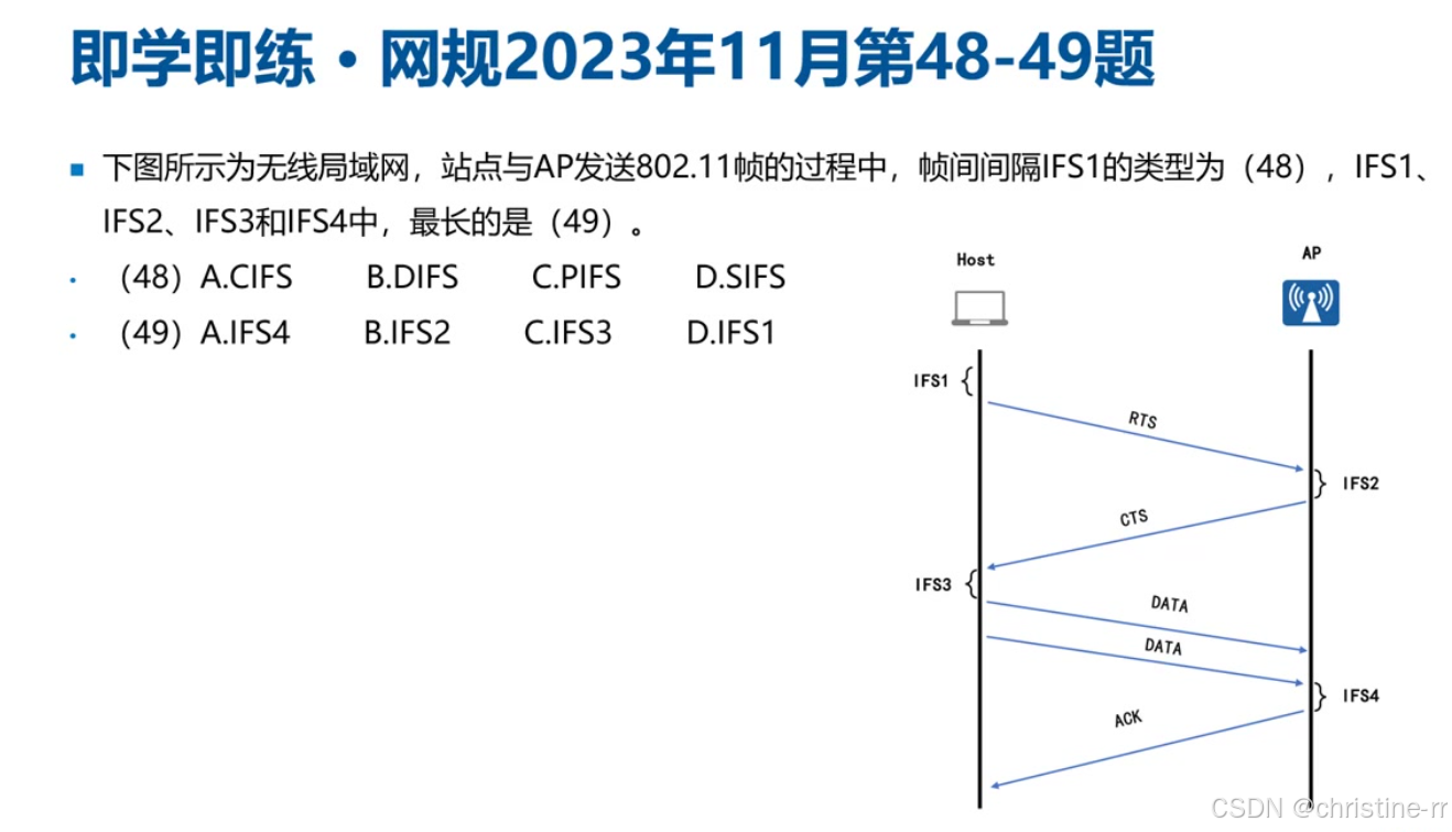 802.11帧间间隔(IFS) | 三种类型: 1. DIFS(最长,优先级最低,竞争访问) 2. PIFS(中等,PCF操作) 3. SIFS(最短,优先级最高,确认/响应) | SIFS用于:ACK确认、RTS/CTS交互 DIFS用于CSMA/CA发送前的等待 易混淆:不同场景的IFS类型选择 | ⭐⭐⭐⭐ |
