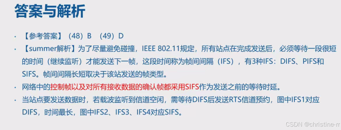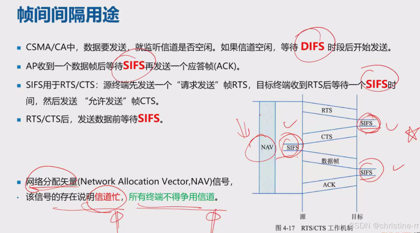 CSMA/CA中: 数据要发送,就监听信道是否空闲。如果信道空闲,等待DIFS时段后开始发送。 AP收到数据帧后: 等待SIFS再发送一个应答帧(ACK)。 SIFS用于RTS/CTS中: 源终端先发送一个“请求发送”帧RTS,目标终端收到RTS后等待一个SIFS时间,然后发送“允许发送”帧CTS。 RTS/CTS后:发送数据前等待SIFS 网络分配矢量信号(NAV):该信号的存在说明信道忙,所有终端不得争用信道。