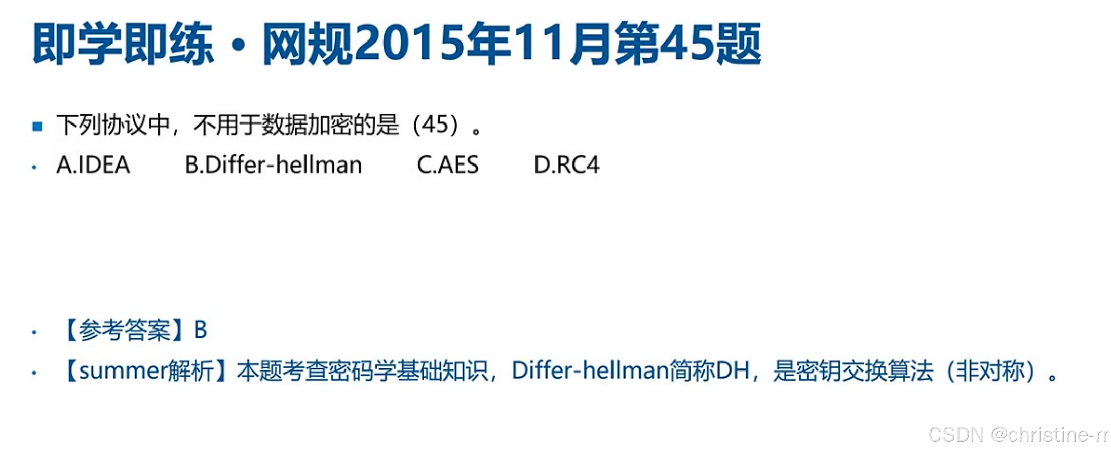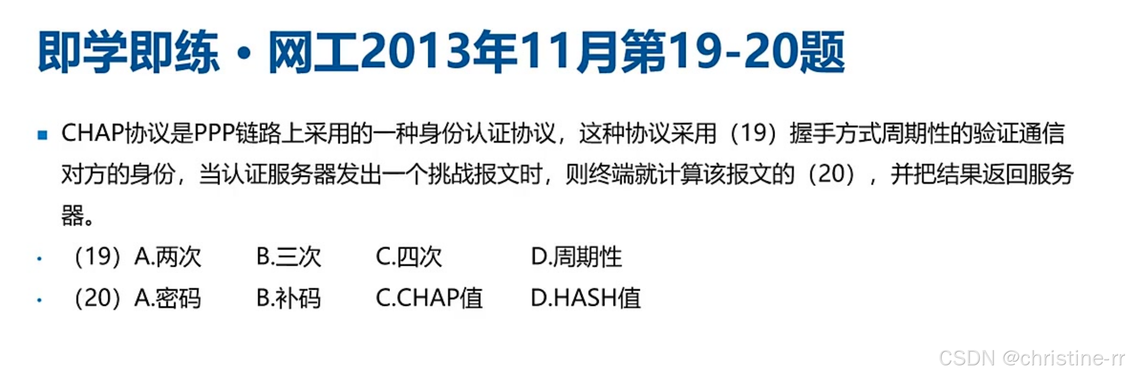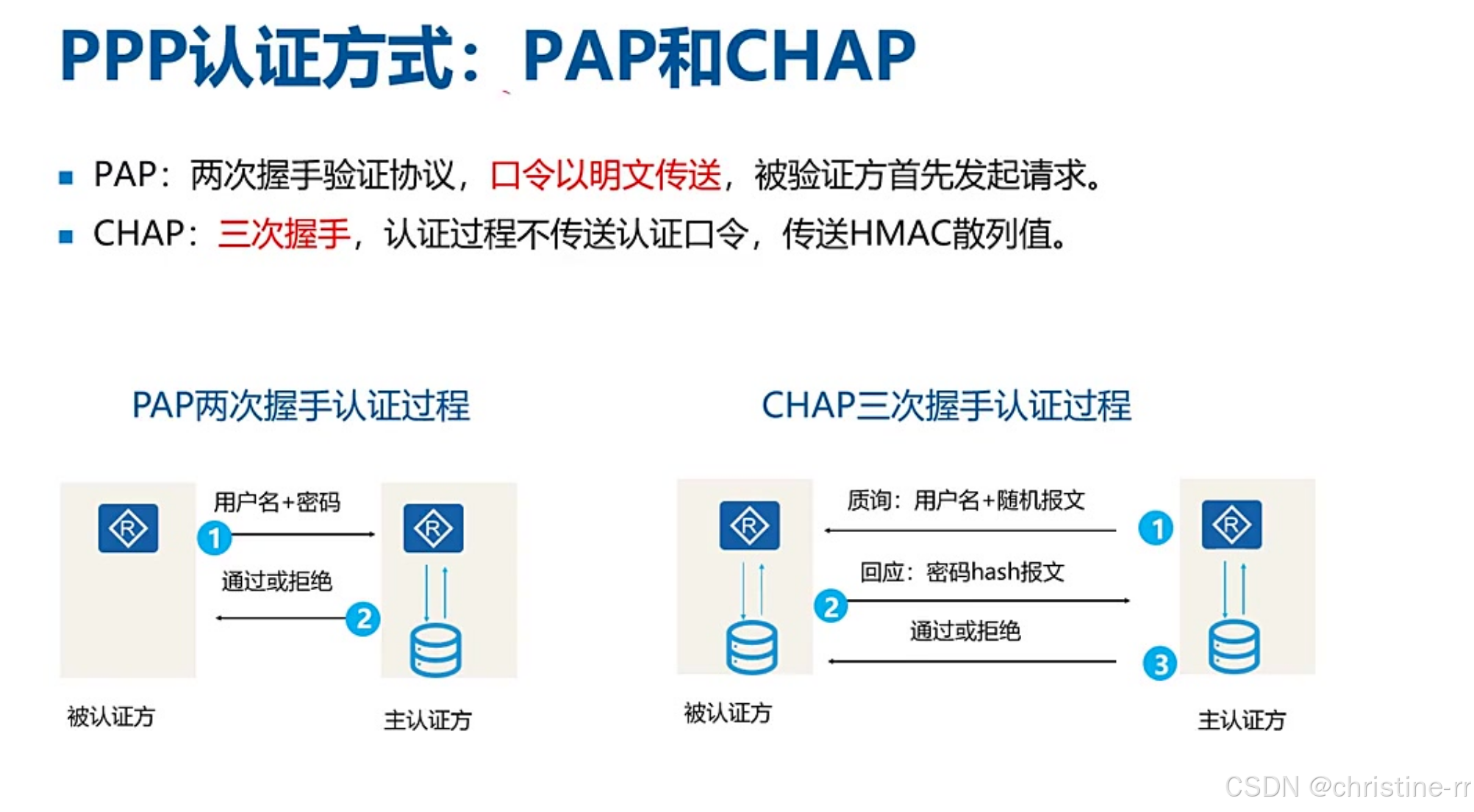 PPP认证协议 | 1. PAP(两次握手明文传输) 2. CHAP(三次握手哈希认证) | CHAP认证过程: 1. 服务器发随机数 2. 客户端计算哈希(密码+随机数) 3. 验证哈希值 | ★★★★☆ |