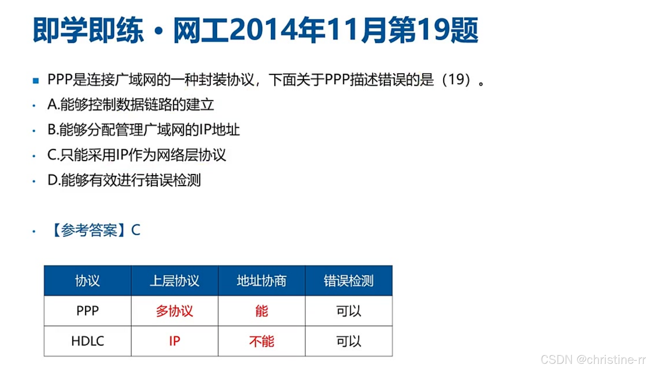PPP(Point-to-Point Protocol)组成 : 包含链路控制协议LCP(对接物理层)和网络控制协议NCP(对接网络层)