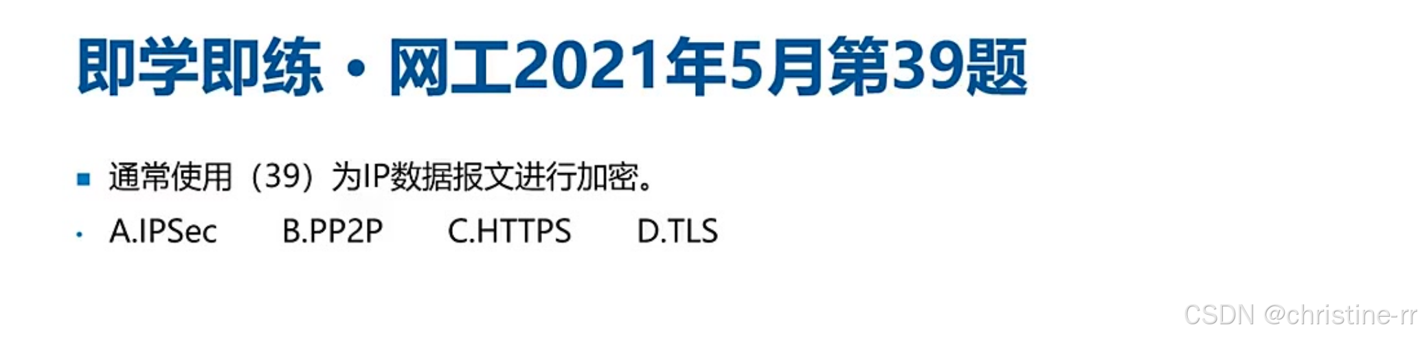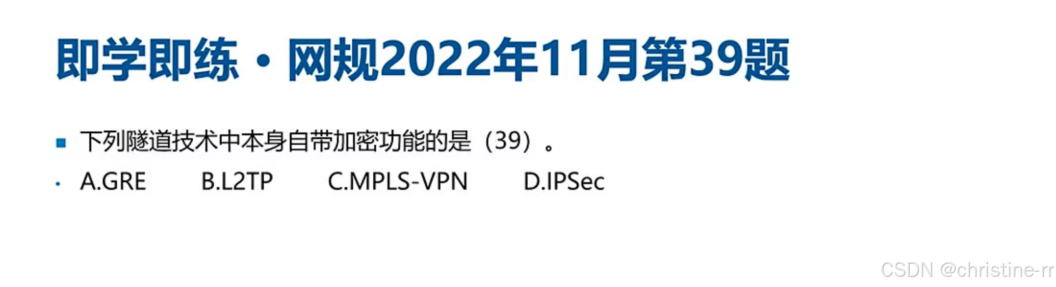VPN实现层次 | 二层:PPTP/L2TP 三层:GRE/IPSec(重点) 传输层:SSL/TLS | GRE支持组播但不加密,IPSec加密但不支持组播 实际常用GRE over IPSec | ★★★★☆ |