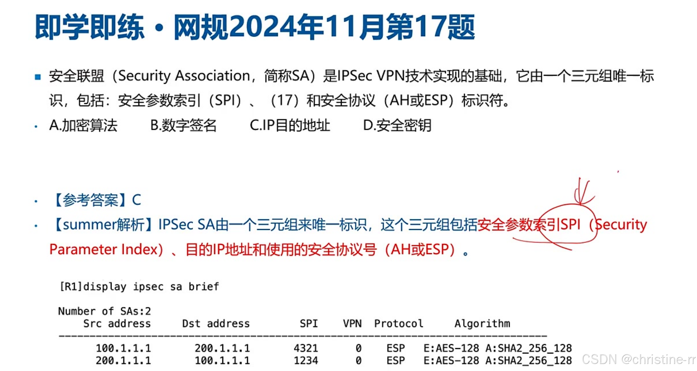 安全联盟SA | SA是ipsec技术实现的基础,由三元组唯一标识:安全参数索引SPI、目的IP地址、安全协议(AH/esp) | SA的三元组组成 | 🌟🌟 |