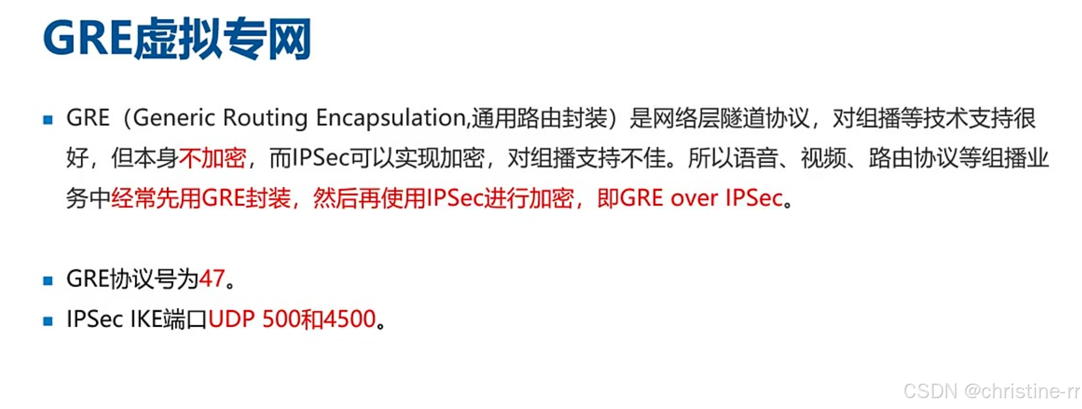 GRE与ipsec的结合 | GRE用于封装,但不加密; ipsec用于加密; 常结合使用(GRE over ipsec) | GRE与ipsec的结合方式及原因 | 🌟🌟 |