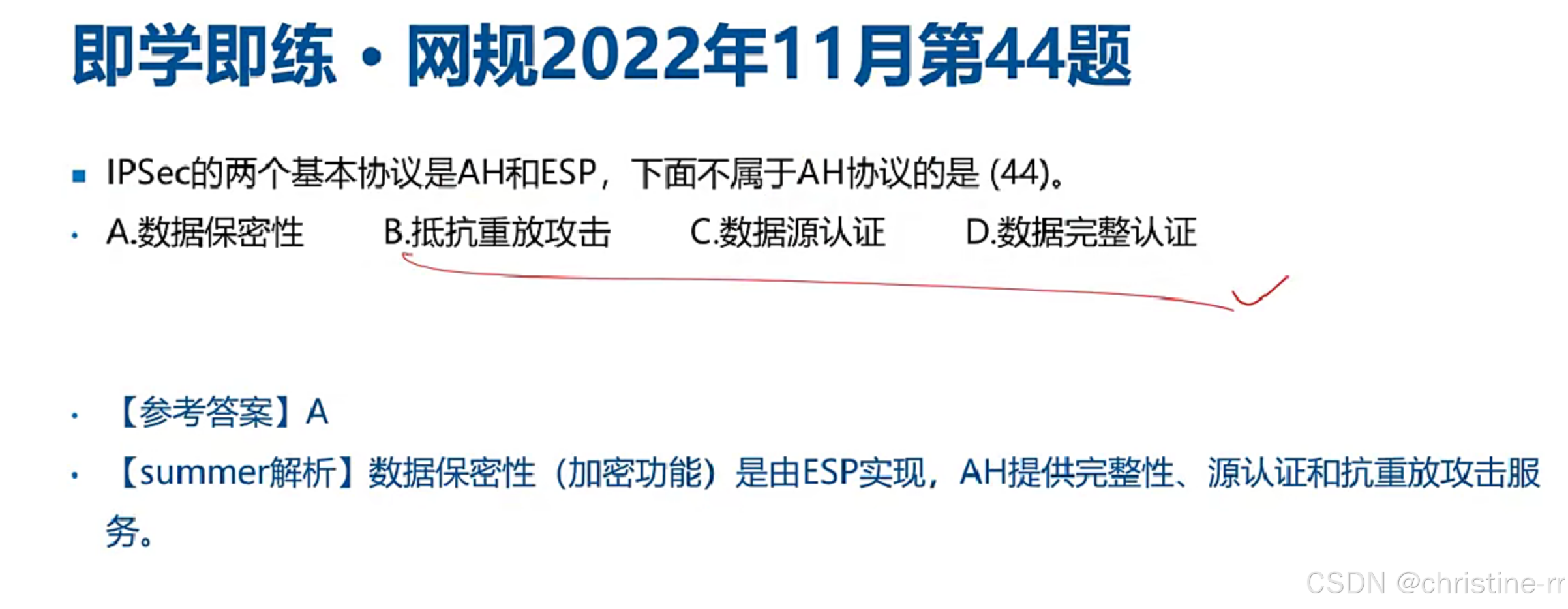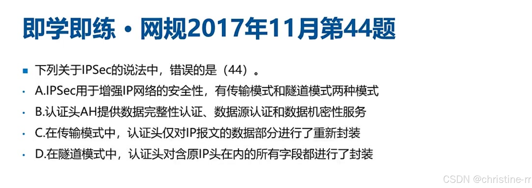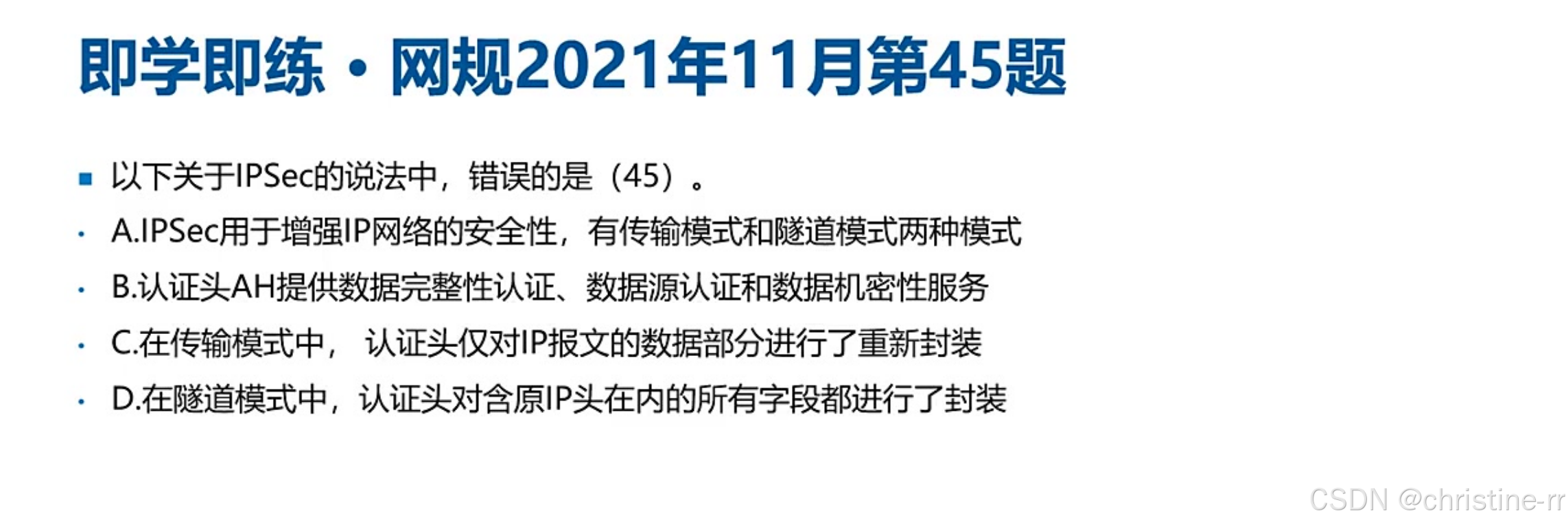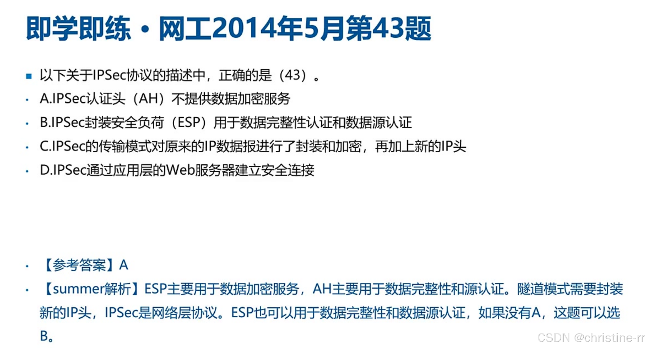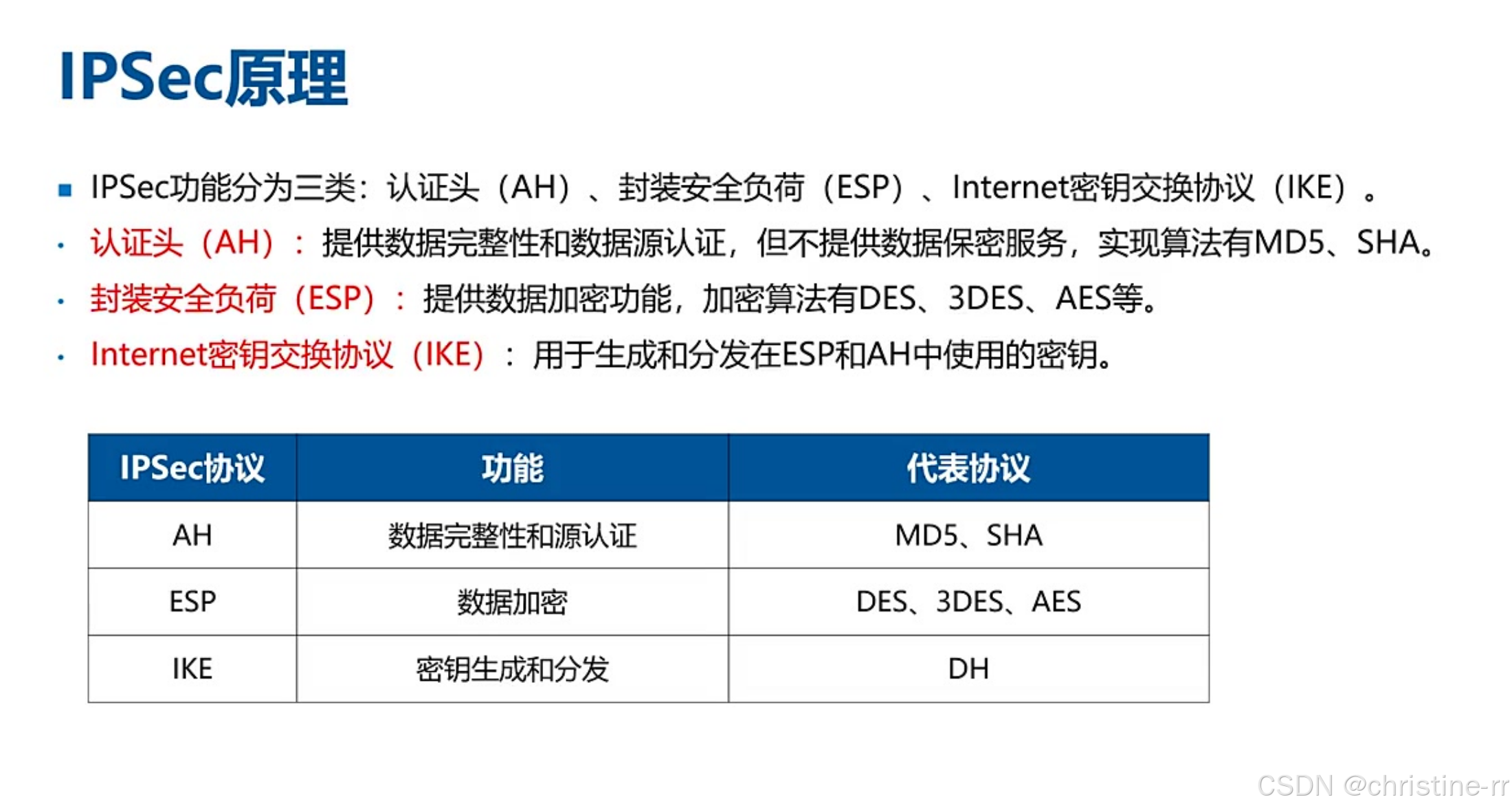 ipsec的子协议功能 | - AH:提供数据完整性和数据原认证,不提供数据加密; - esp:提供数据加密功能; - ike:用于生成和分发密钥 | AH不提供数据加密;esp提供数据加密;ike的功能 | 🌟🌟🌟 |