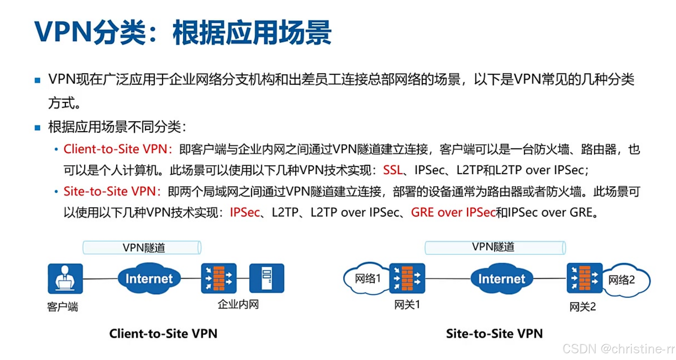 VPN分类(按场景) | 1. Client to Site(远程接入VPN) 2. Site to Site(站点间VPN) | Client to Site常用SSL/IPSec Site to Site最常用IPSec/GRE over IPSec | ★★★☆☆ |