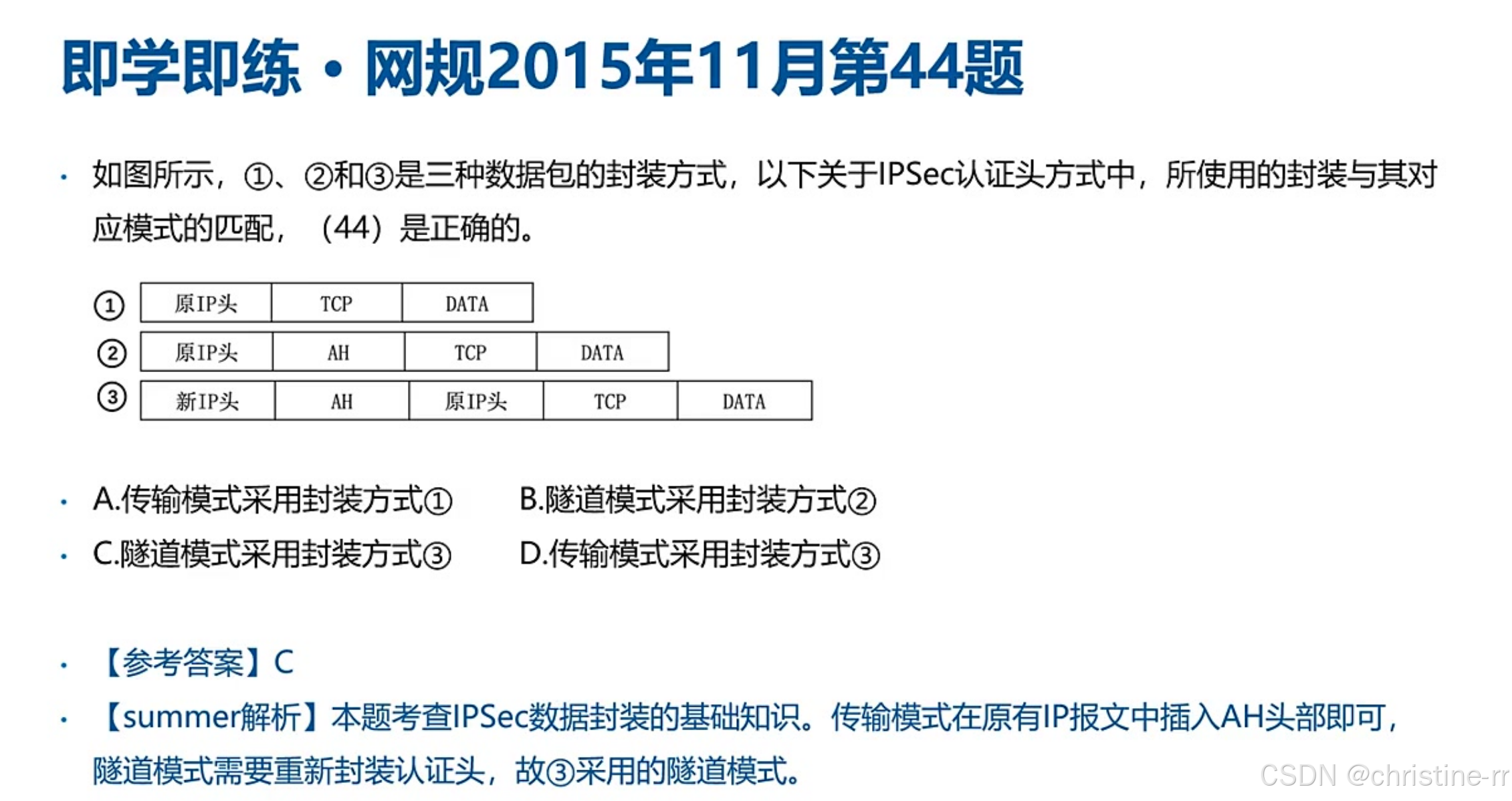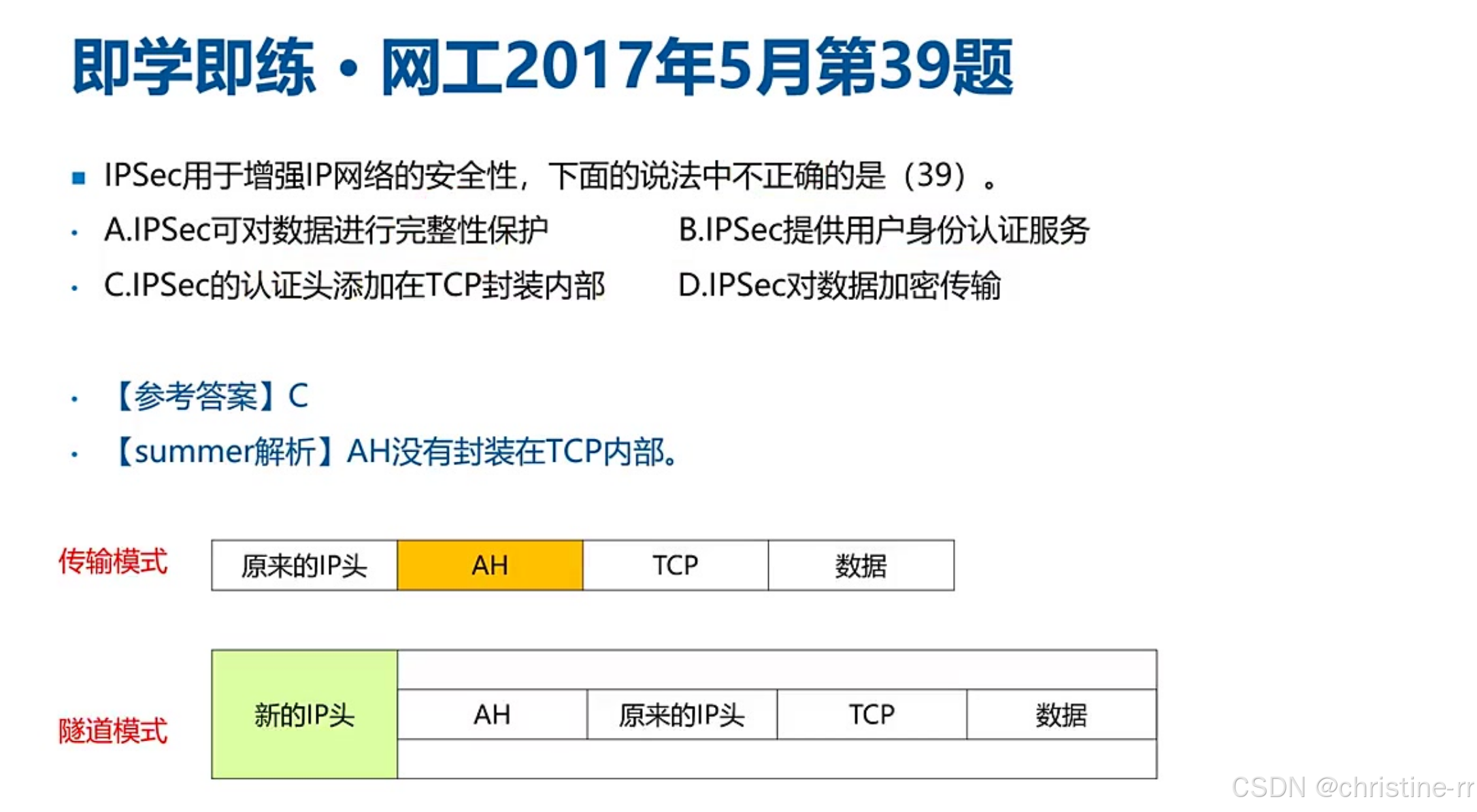 易混淆点:隧道模式与传输模式 | 隧道模式添加新IP头,开销大,安全性高; 传输模式效率高,安全性不如隧道模式 | 隧道模式与传输模式的优缺点及区分 | 🌟🌟🌟 |