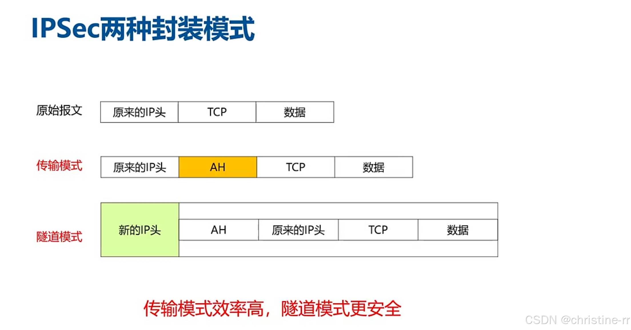 ipsec的封装模式 | - 传输模式:在原有报文中间插入AH/esp头; - 隧道模式:添加新的IP头,封装原有报文 | 传输模式与隧道模式的区别 | 🌟🌟🌟 |