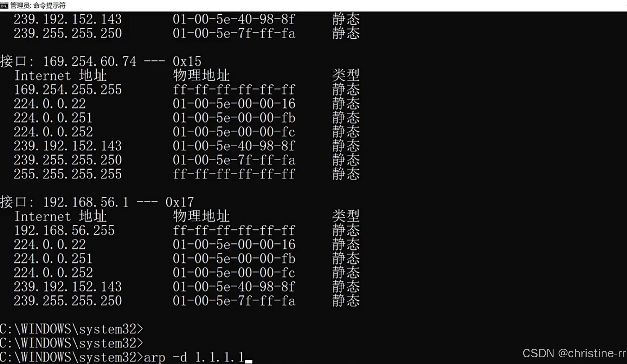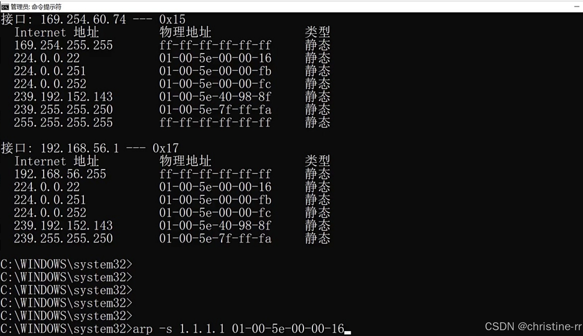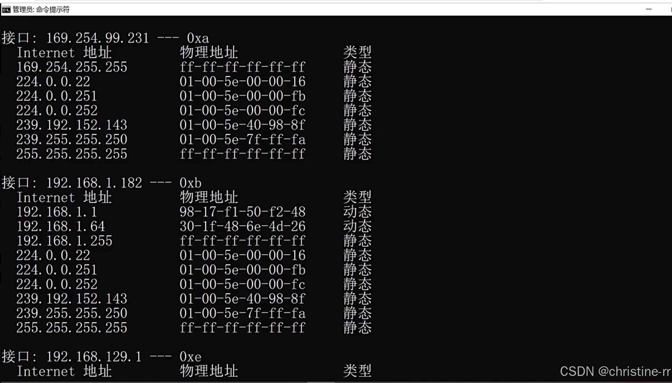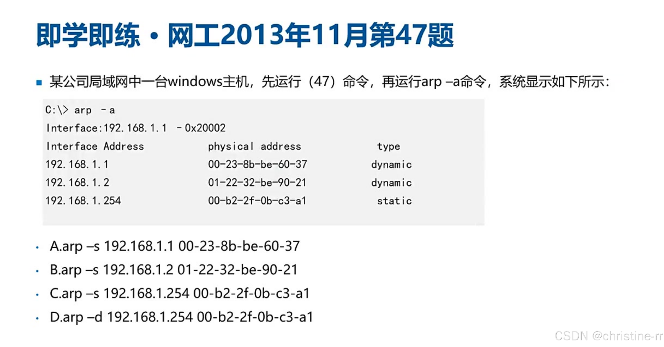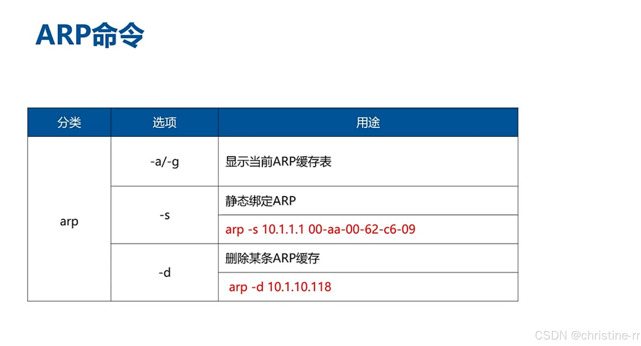 ARP命令 | -a显示缓存, -s静态绑定, -d删除(动态/静态均可删) | 静态绑定需手工输入MAC,类型区分动态/静态 | ⭐⭐⭐ |