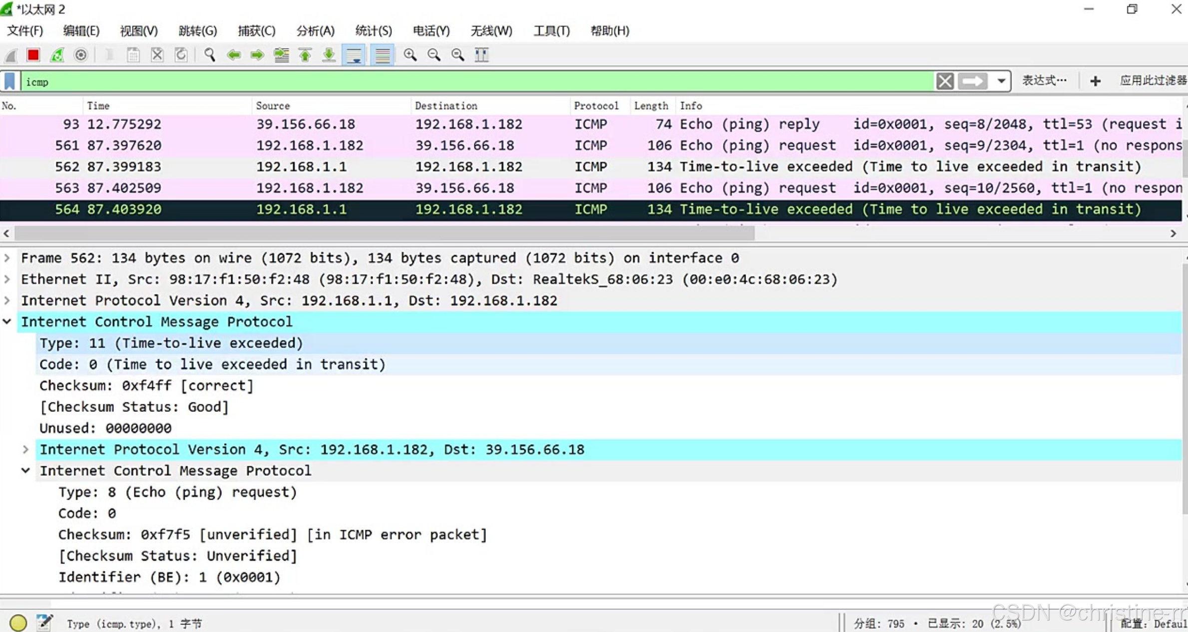 ping | 检测连通性,测试延迟(ICMP报文:type=8请求,type=0回复) | -t持续测试, -n指定包数, TTL=64-53=11跳 | ⭐⭐⭐ |