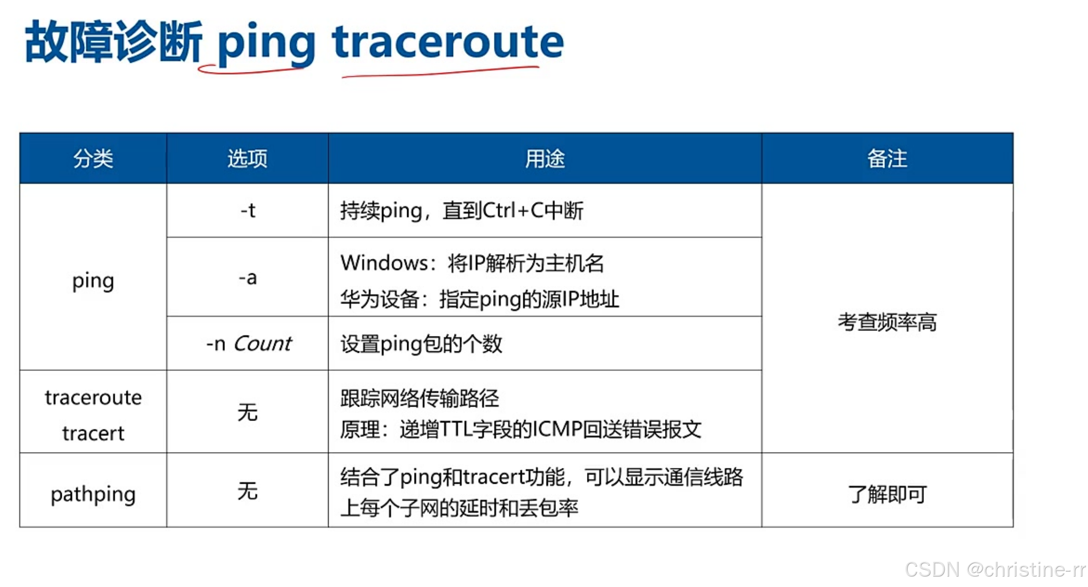 tracert | 路径跟踪(TTL递增触发type=11超时报文) | Linux用traceroute,ICMP type/code高频考点 | ⭐⭐⭐⭐ |