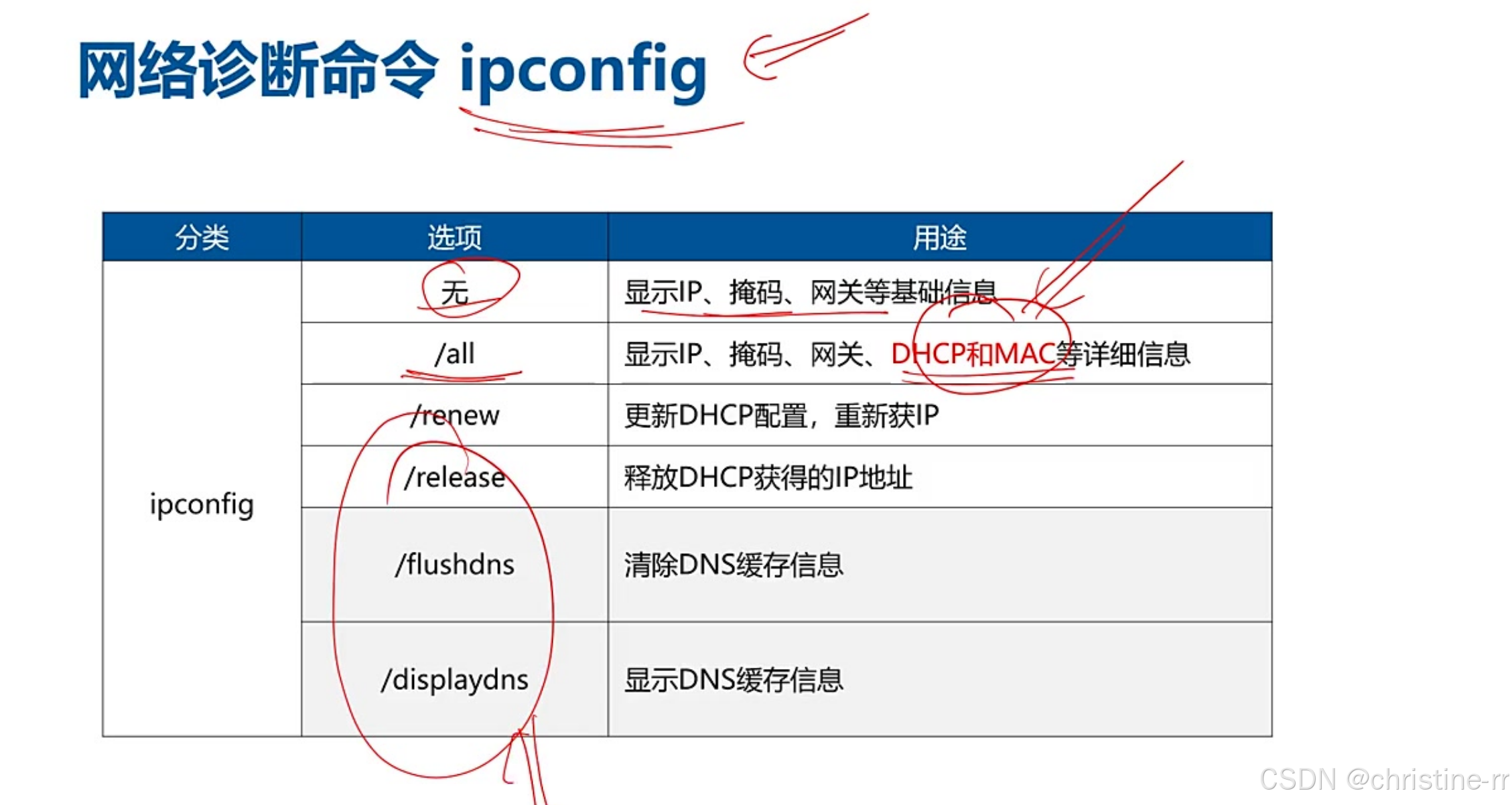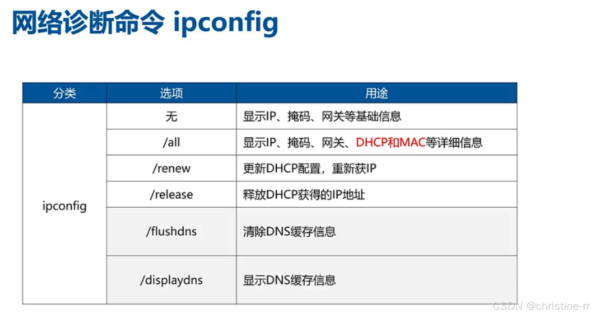 ipconfig renew/release | release释放DHCP IP,renew重新获取 | 案例分析高频考点,第一个包超时原因:ARP解析延迟 | ⭐⭐⭐ |