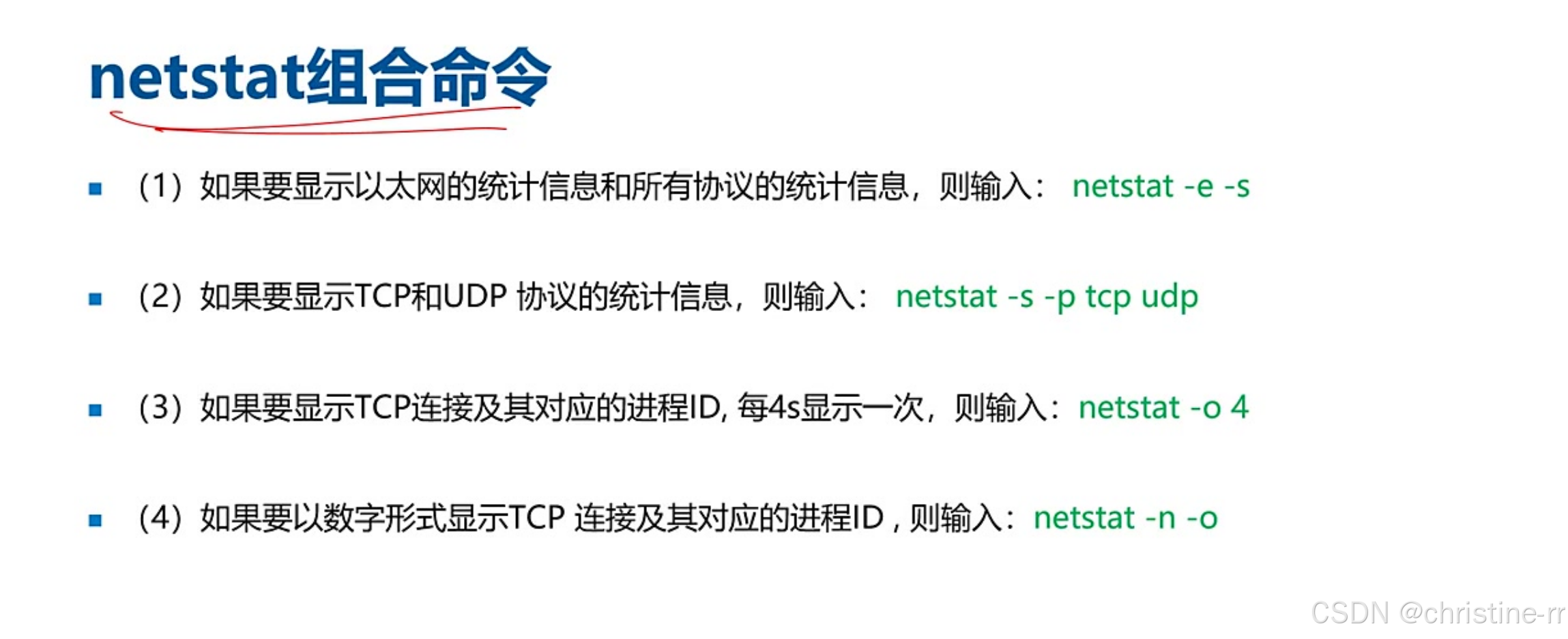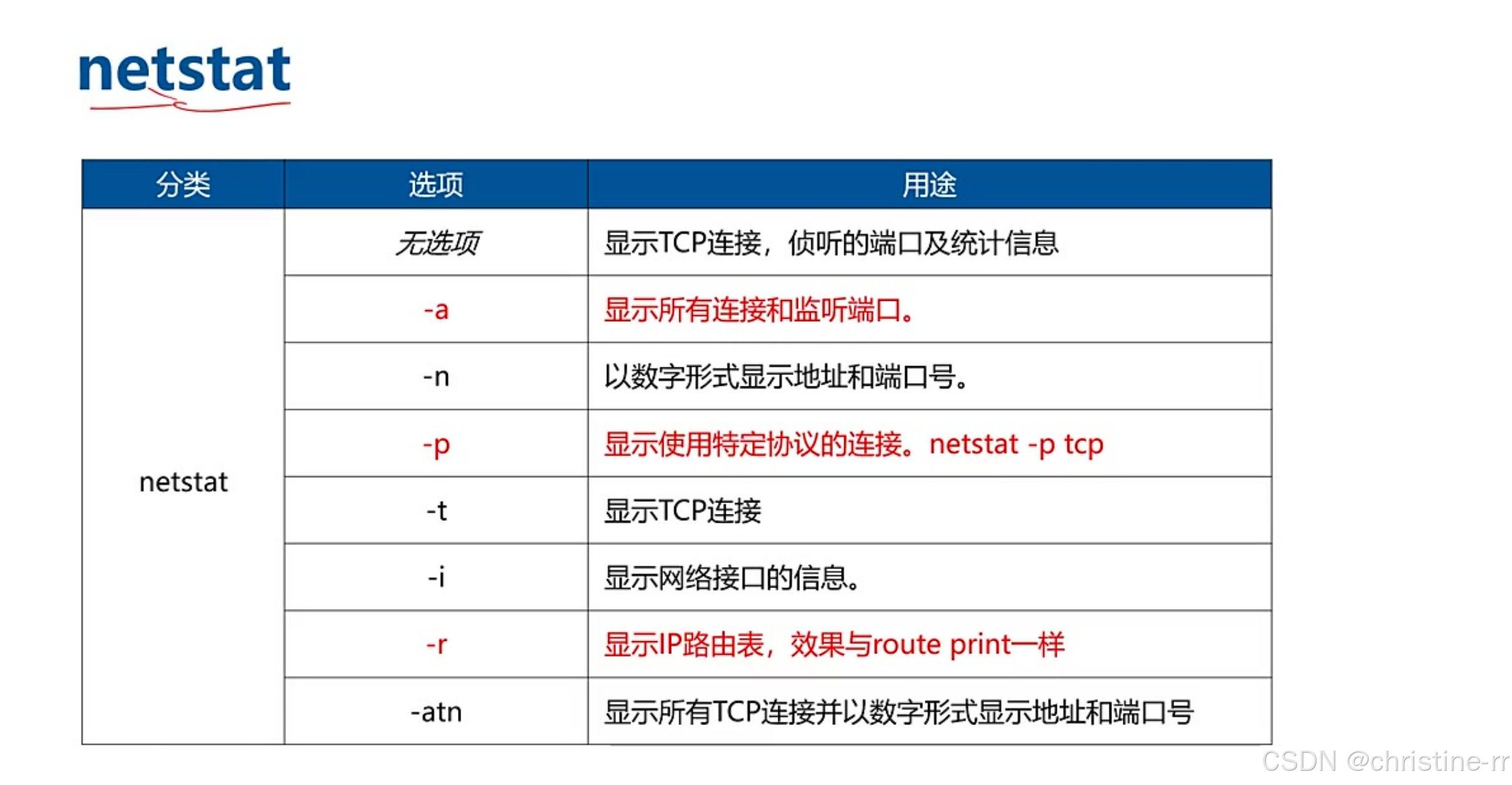 ifconfig、ip addr(Linux):查看和配置网络接口参数ping:测试网络连通性traceroute(Linux) / tracert(Windows):追踪数据包传输路径netstat:显示网络连接、路由表、接口统计等信息route:查看和操作IP路由表nslookup:DNS查询工具
