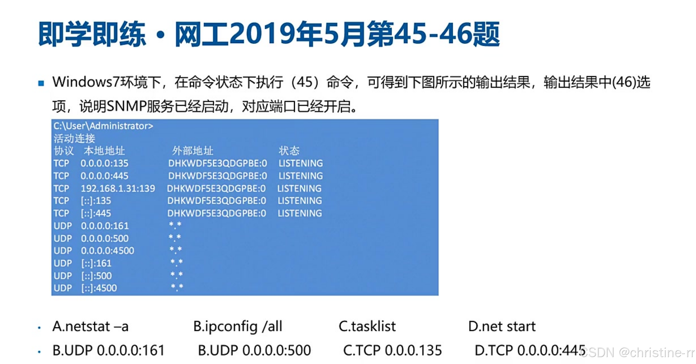 SNMP端口 | 161(被管端,客户端), 162(网管服务器) | netstat显示监听端口,服务启动标志 | ⭐⭐⭐ |