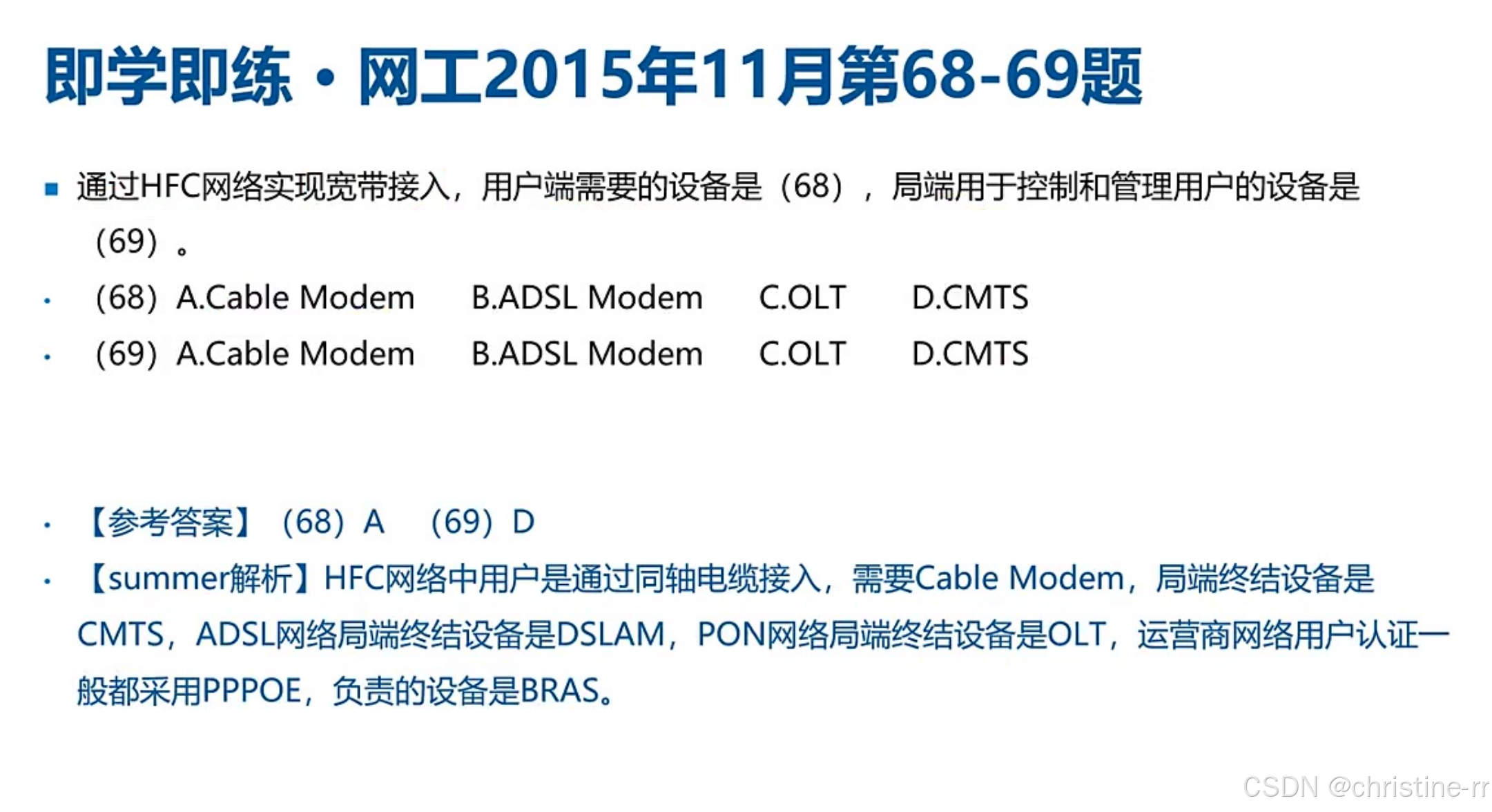 练习题答案 | 各年份练习题答案,如HFC网络用户端设备、ADSL接入设备等 | 练习题的具体答案与解析 | 🌟(根据具体题目难度调整) |