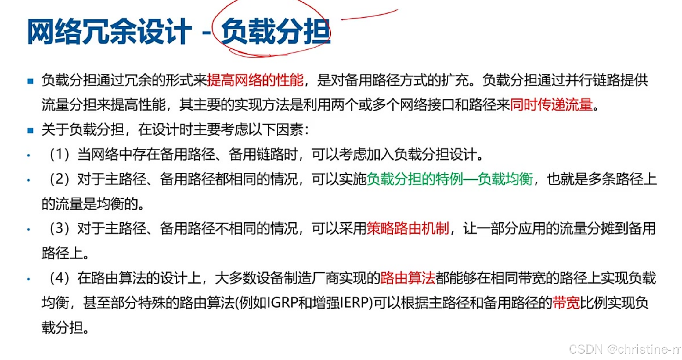 负载分担 | 通过并行链路同时传递流量(如双活数据中心),提升网络性能 | 与负载均衡区别:负载均衡需主备链路带宽相同 | ★★★★☆ |