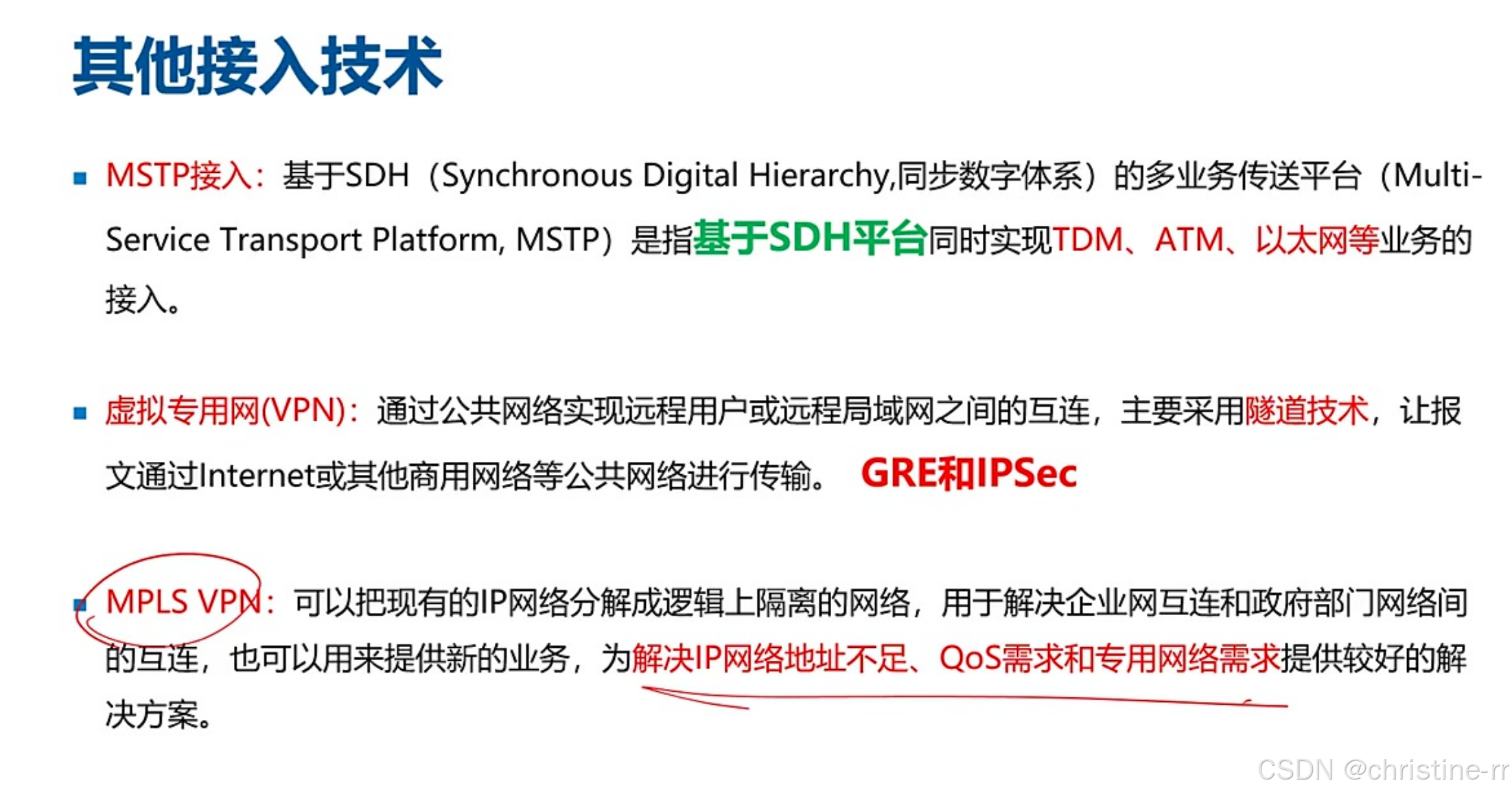其他接入技术 | MSTP、虚拟专网(如GRE、IPSec、MPLS VPN) | 其他广域网接入技术的了解 | 🌟 |