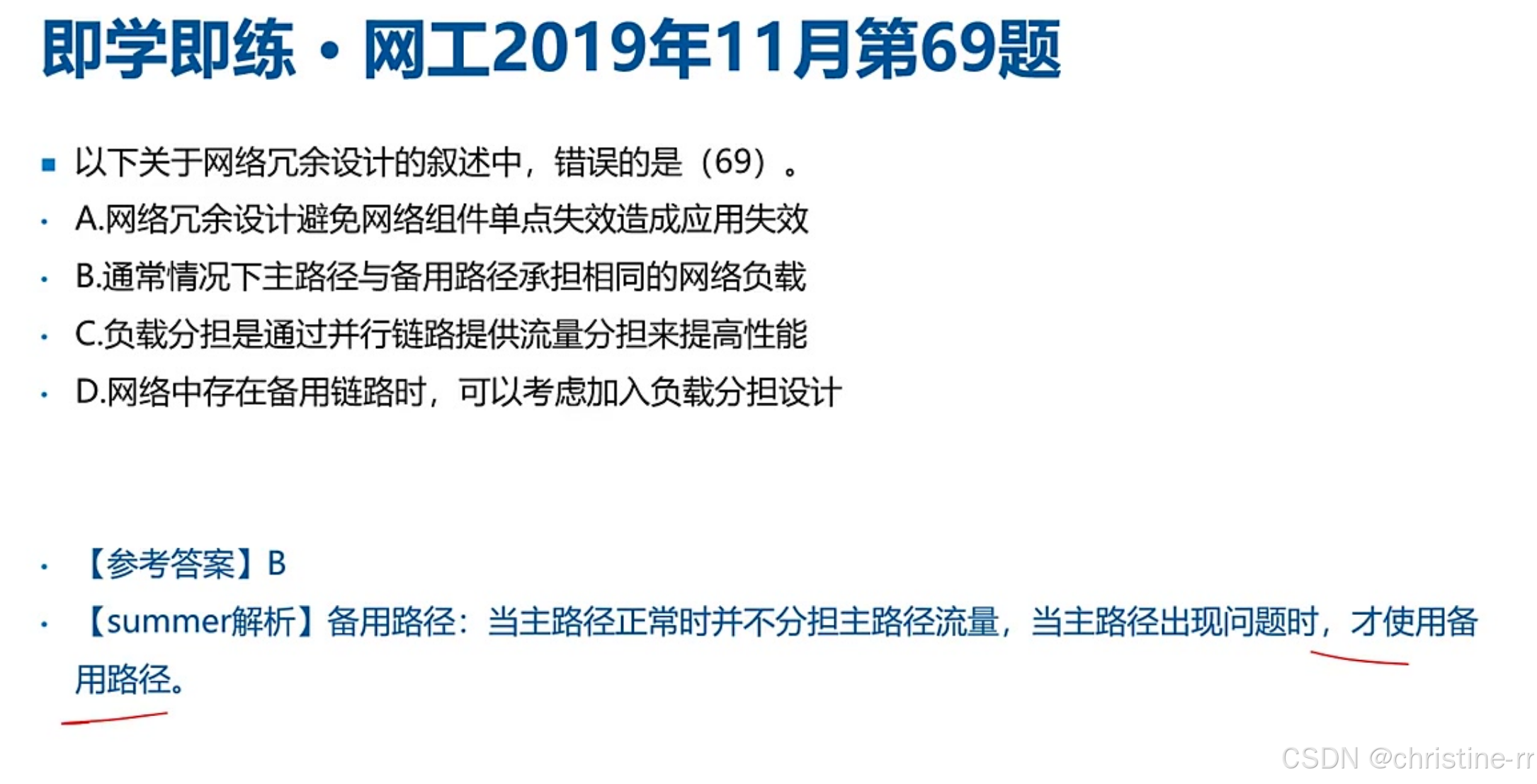 典型考题解析 | 2019年题:B选项错误(备用路径不承担相同负载) 2023年题:D正确(虚拟化可实现冗余) | 混淆点:备用路径“提高性能”说法错误 | ★★★★☆ |