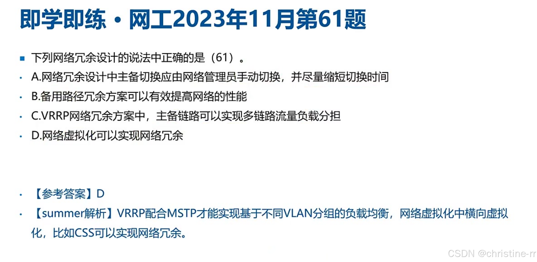 网络冗余方案对比 | - 主备路径:冷备,不提升性能 - 负载分担:热备,提升性能 - 虚拟化(如堆叠):模拟冗余设备 | VRRP仅支持主备,需结合MSTP实现分担 | ★★★☆☆ |