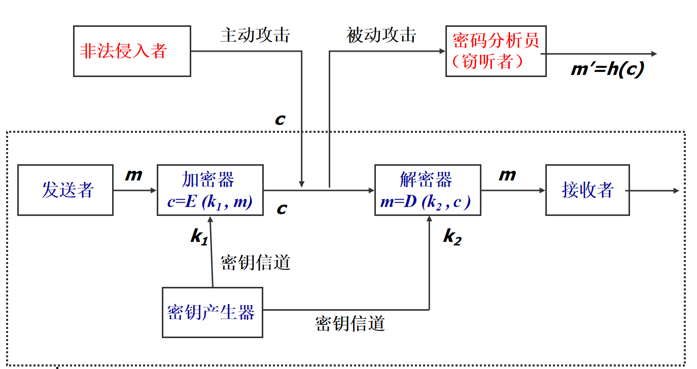- 密码分析:截收者通过分析可能从截获的密文推断出原来的明文或密钥。