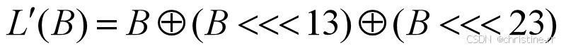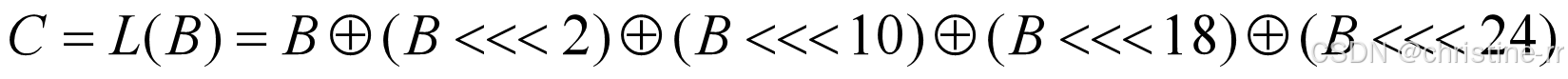 线性变换部件L是以字为处理单位的线性变换,其输入输出都是32位的字,它的密码学作用是扩散。 设 L的输入为字B,输出为字C,则