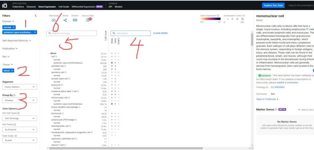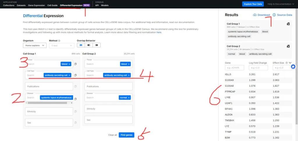 1.选择Differential Expression模块;2:选择SLE与Normal;3:选择blood。4;选择细胞类型(也可以不选择,只进行组织水平比较)。5:点击Find genes;6:差异结果展示与查询界面;7:下载差异分析结果。