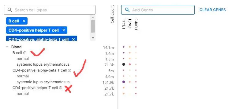 在5所在位置选择细胞类型。如下图所示,有些细胞类型在normal与SLE中均有注释到,因此存在两个组。但有些细胞类型只在normal组注释到,因此无法比较。右侧基因的大小与颜色代表该基因在细胞类型中A中表达的比例与相对表达水平。这个图片结果可知,在B细胞、CD4+T细胞中,IFI44L,OAS1在SLE中表达较高。而foxp3表达差异不明显。