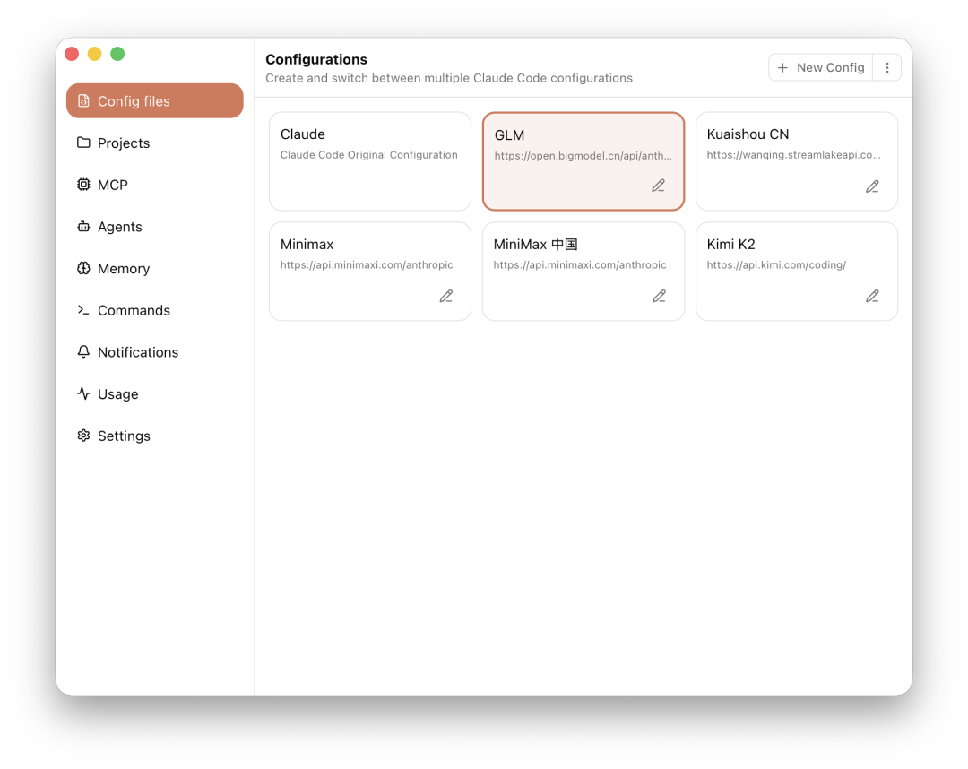 下图是 CC Mate 的主界面,深色模式,左侧是功能菜单(Config files、Projects、MCP、Agents、Memory、Commands 等),右侧以卡片形式展示各个配置项(支持 Claude、GLM、Kimi K2、Minimax 等多种模型):