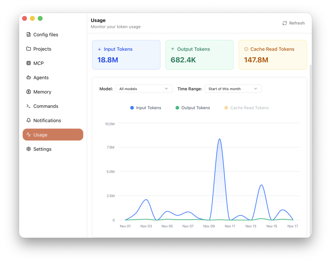 下图是使用量分析仪表盘,顶部展示 Input Tokens、Output Tokens 和 Cache Read Tokens 三大核心指标,中间折线图按日期展示 Token 消耗趋势: