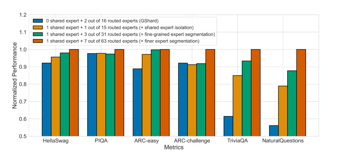 将专家进一步细分为更细粒度来进行更详细的比较。每个专家分割为2个或4个更小的专家,总共得到32个(1个共享+31个路由)或64个(1个共享+63个路由)专家。上图显示了一个一致趋势:专家分割粒度的持续细化对应于整体模型性能的持续提升。这些发现为细粒度专家分割策略的有效性提供了支撑。