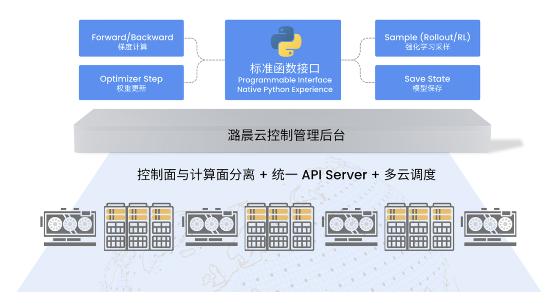开发者只需描述数据与算法,其余(租卡、配环境、并行策略、运维调度、故障自愈,乃至RL涉及的一系列工程化的工作)全部下沉到用户无感。