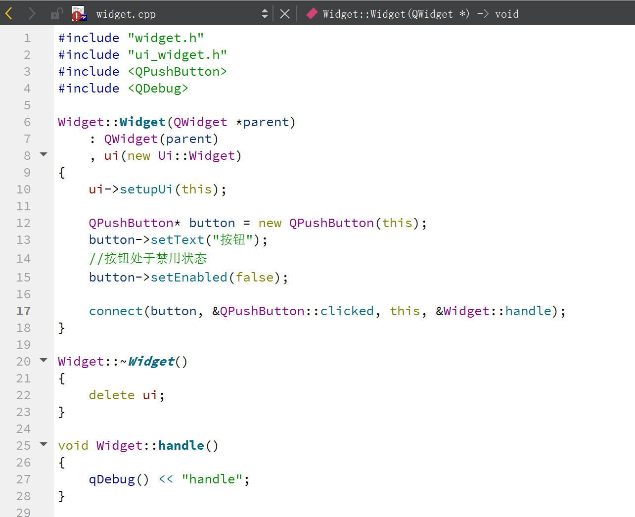 connect(button, &QPushButton::clicked, this, &Widget::handle);