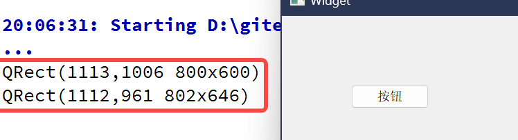 } 运行程序后,构造函数中两者的输出一致,而点击按钮后,frameGeometry的宽度和高度会比geometry大(包含了窗口边框)。
