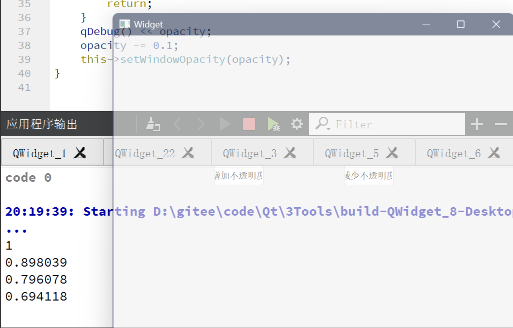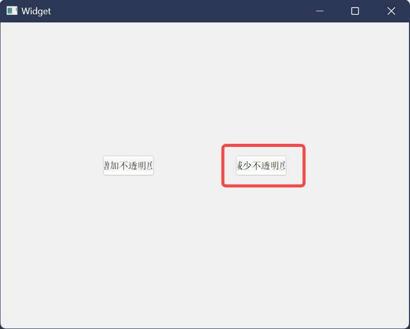 }运行程序后,点击 “减少透明度” 按钮,窗口会逐渐变透明;点击 “增加透明度” 按钮,窗口会逐渐恢复不透明。需要注意的是,C++ 中的 float 类型存在精度误差,比如 1.0 - 0.1 的结果并非严格等于 0.9,这是正常现象。